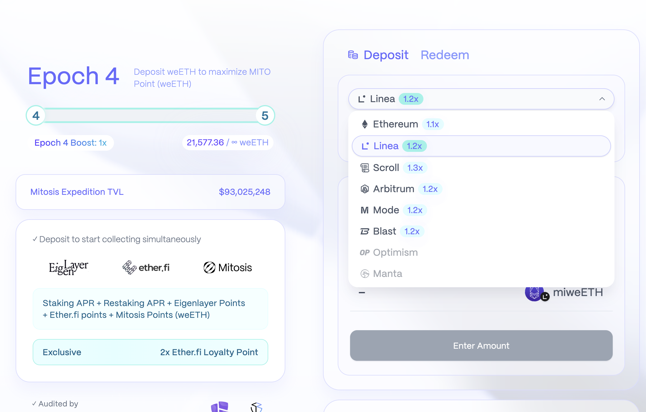 - 예를 들어 Linea를 선택하는 경우 아래와 같이 weETH를 예치하여 miweETH로 교환하고 추가적인 포인트 파밍을 하게 됨.
