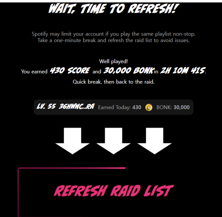 * Raid 리스트의 곡들을 들어야 포인트가 쌓입니다. Raid 리스트 검색이 잘안되는 분은 홈페이지에서 Raid 곡 참고하면 됩니다. Raid 곡들을 즐겨찾기에 추가해두면 좋습니다.