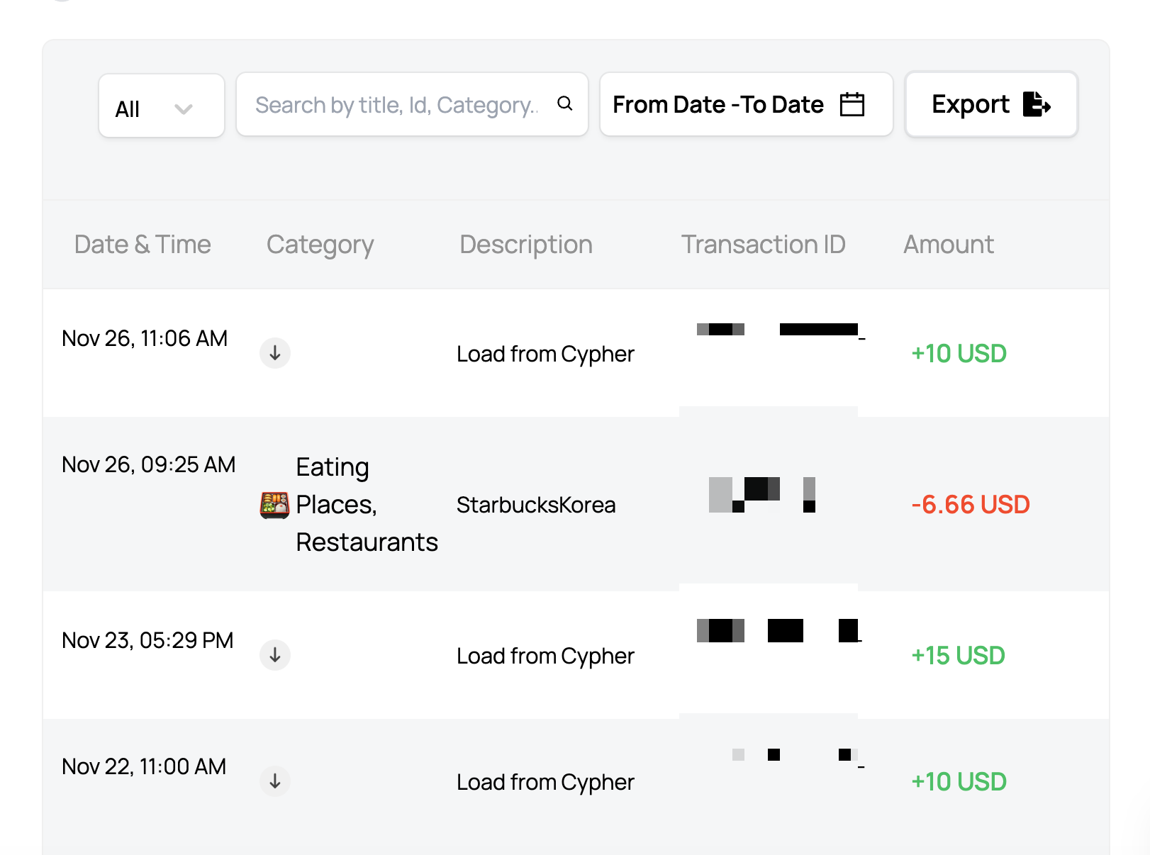 그리고 홈페이지에도 아래와 같이 스타벅스 코리아에서 6.66 달러 쓴게 나온다.