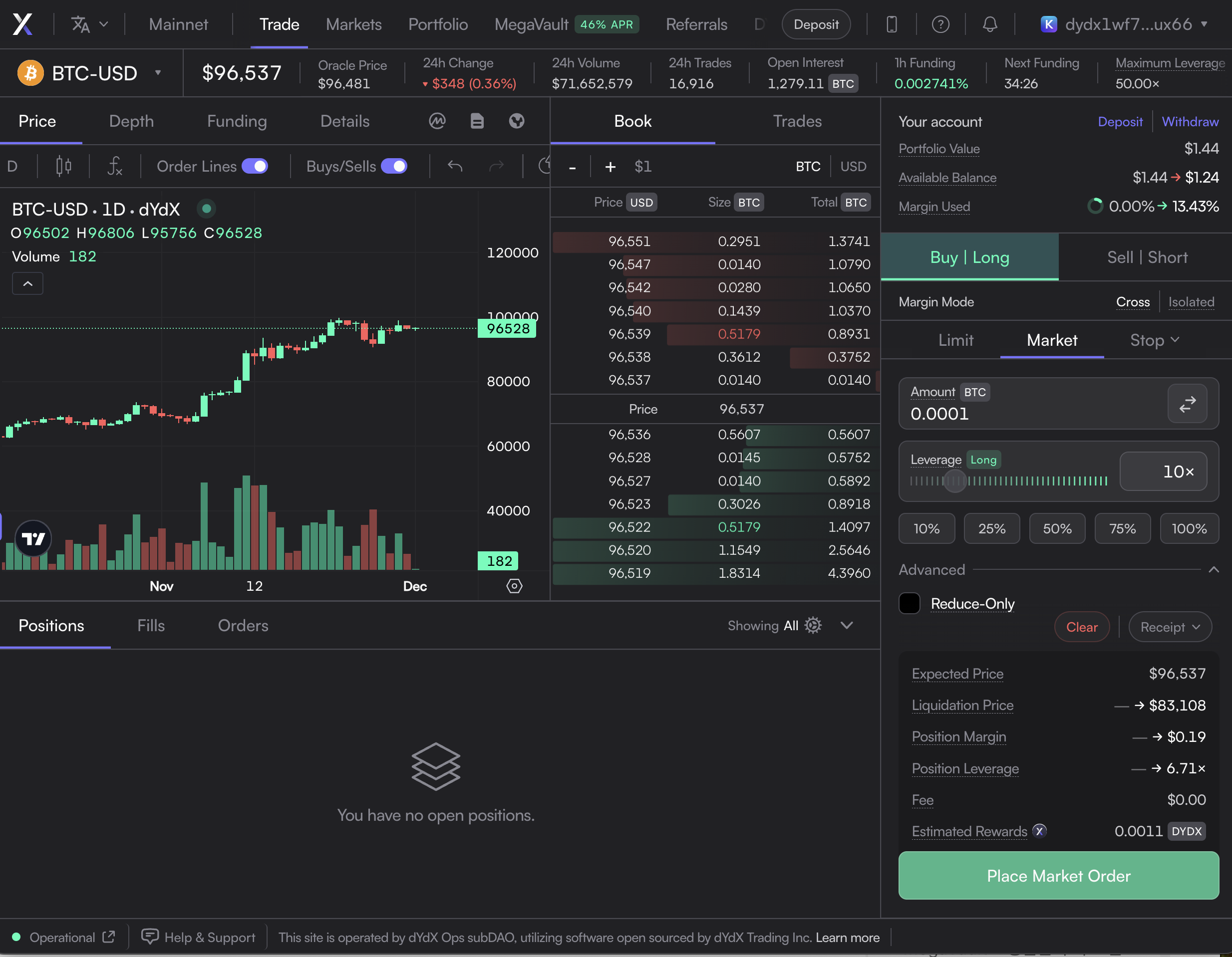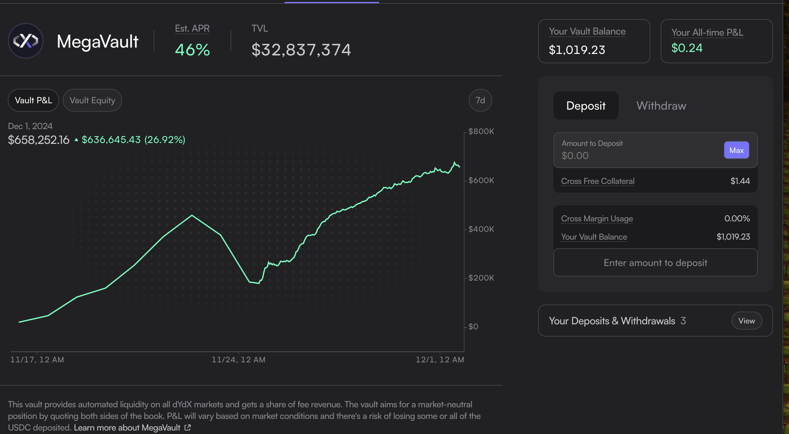 - 사전에 상세 FAQ를 반드시 읽어보고 참여하세요 https://help.dydx.trade/en/articles/240151-megavault-faq