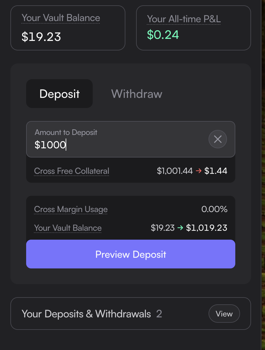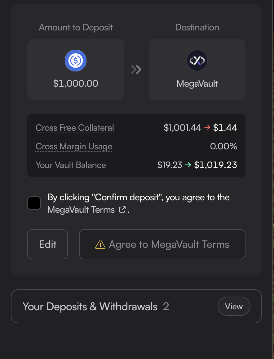2. USDC를 MegaVault에 예치하기 (손실 있을 수 있음)