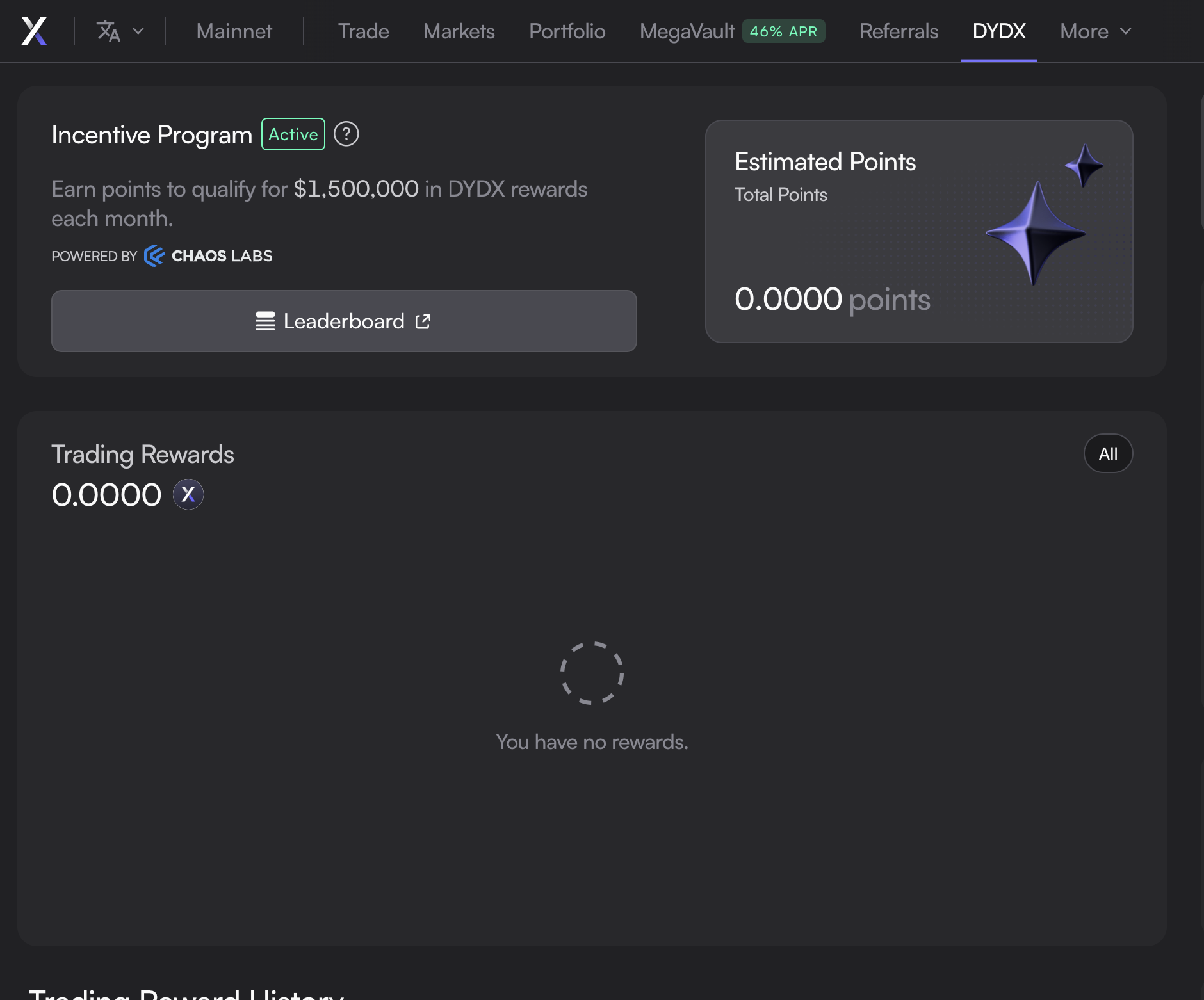 - 트레이딩 볼륨에 따라서 포인트가 쌓이고 이 포인트 기준으로 매달 $1,500,000 의 dYdX가 리워드로 제공됩니다.