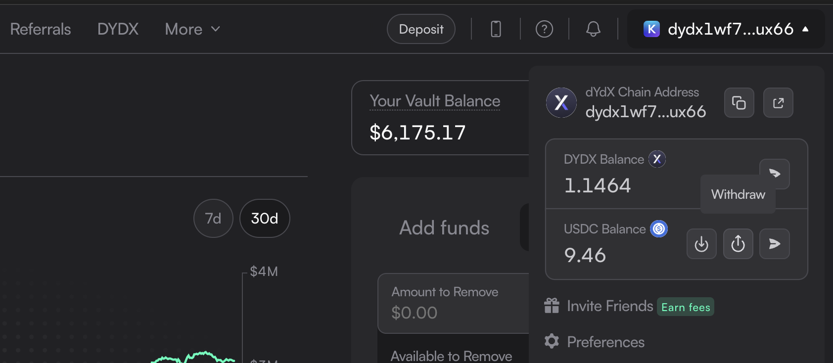 - dYdX Chain Address에서 USDC balance - withdraw 메뉴 클릭
