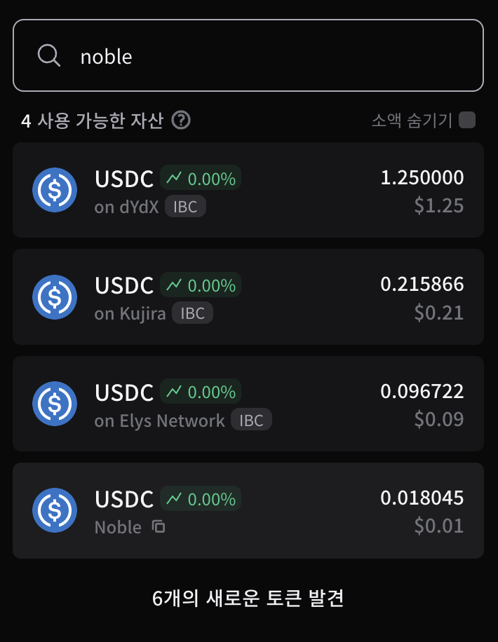 - 케플러에서 Noble 검색 후 해당 USDC 주소를 복사합니다.