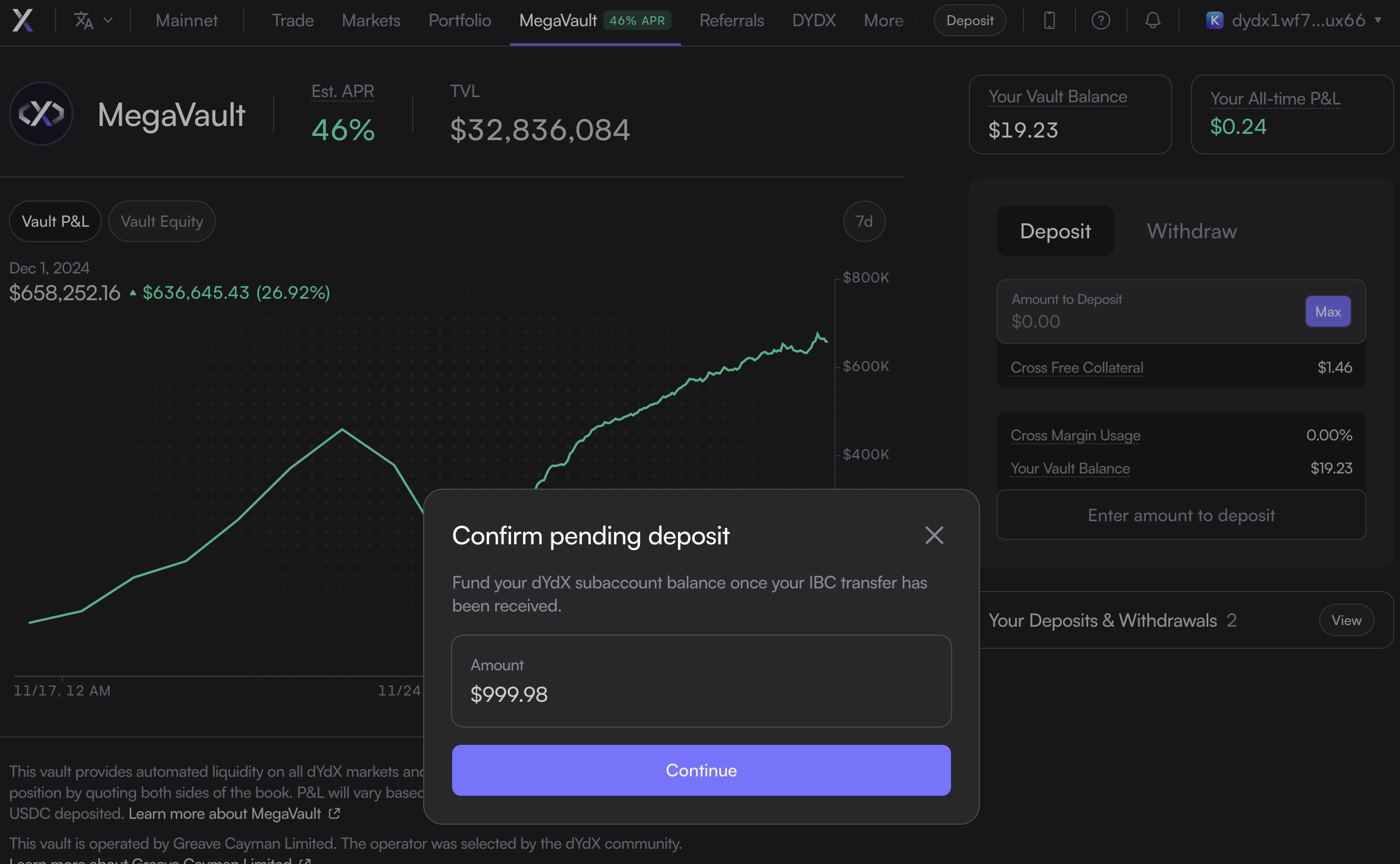 1. dydx 스테이킹 한 이자로 megavault에 추가 예치
