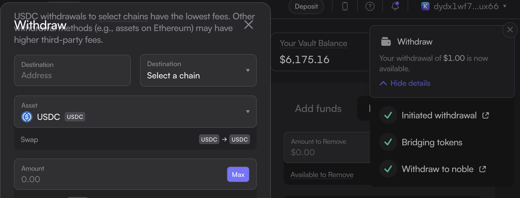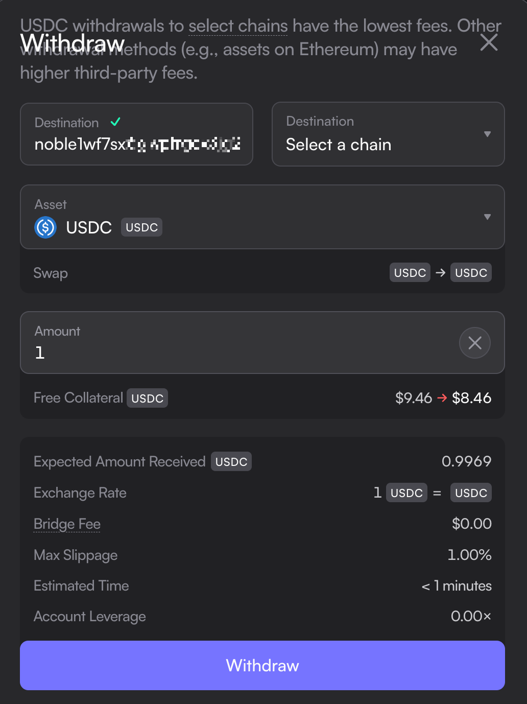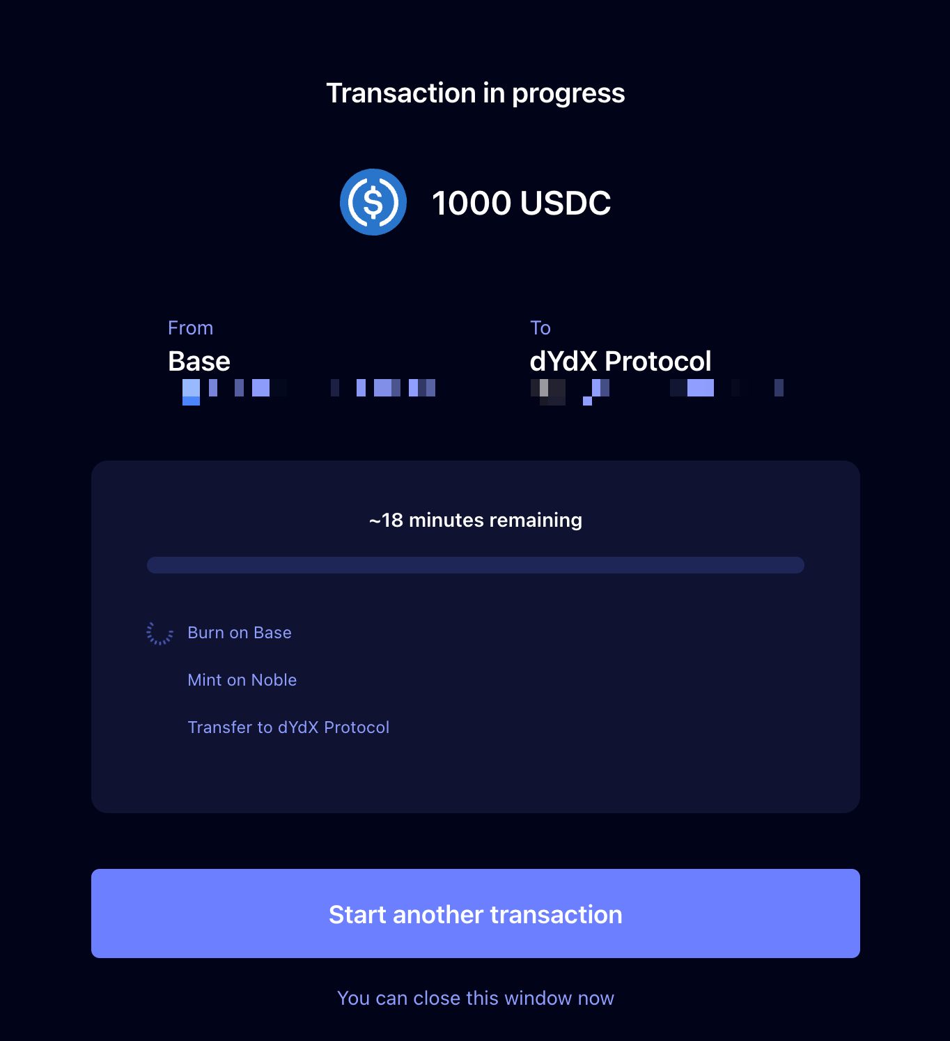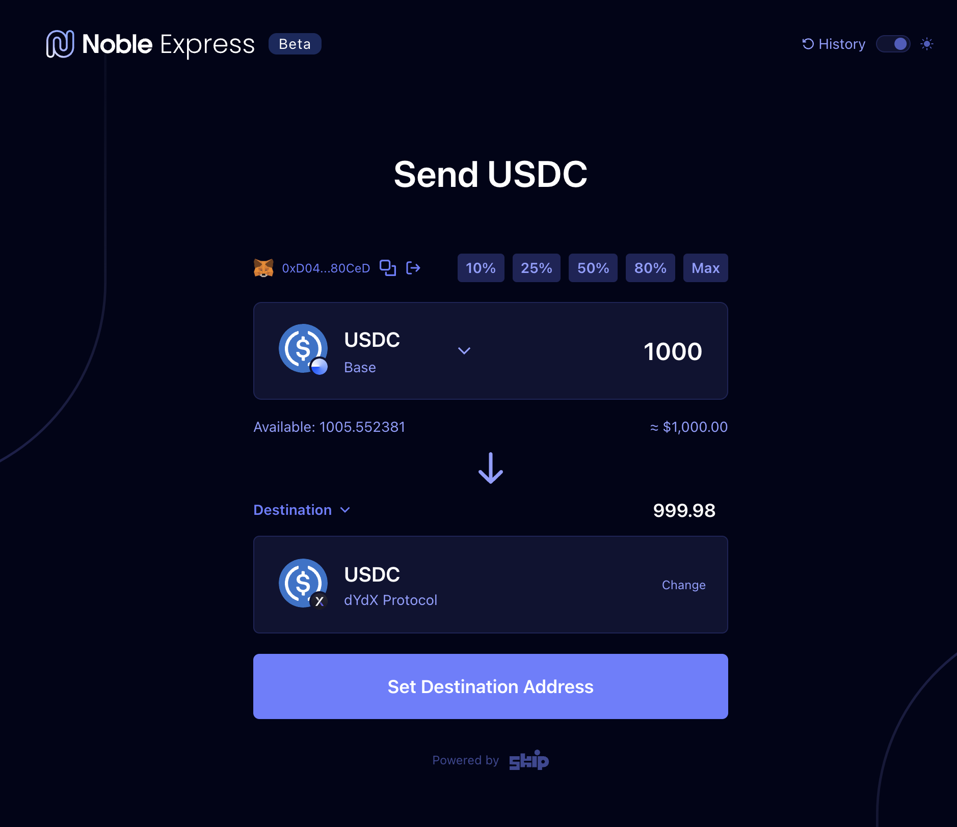 - Noble Experss : https://express.noble.xyz/transfer?origin=base&destination=dydx