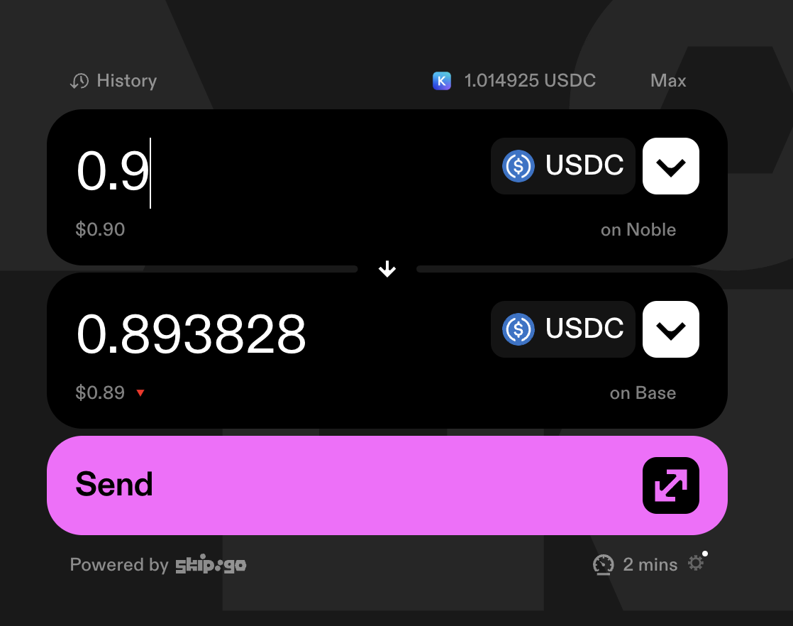 - Skip에서 보내는곳 USDC,Noble 선택, 받는곳 Base, ETH 선택 후 보내면 됩니다.