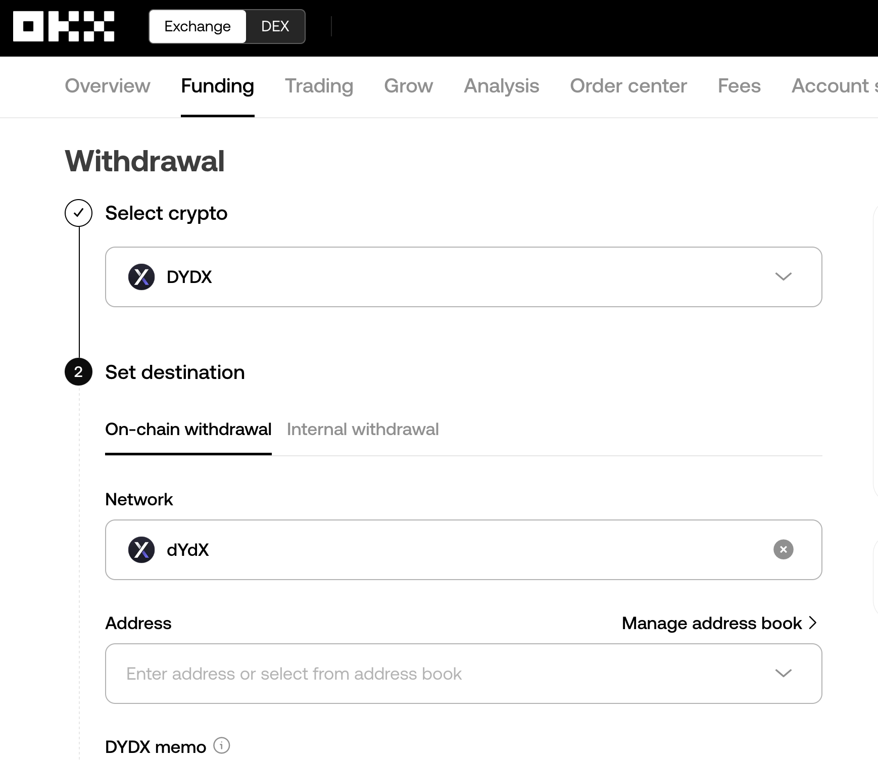 - 반드시 dYdX체인을 선택해야 함(erc20 아님)