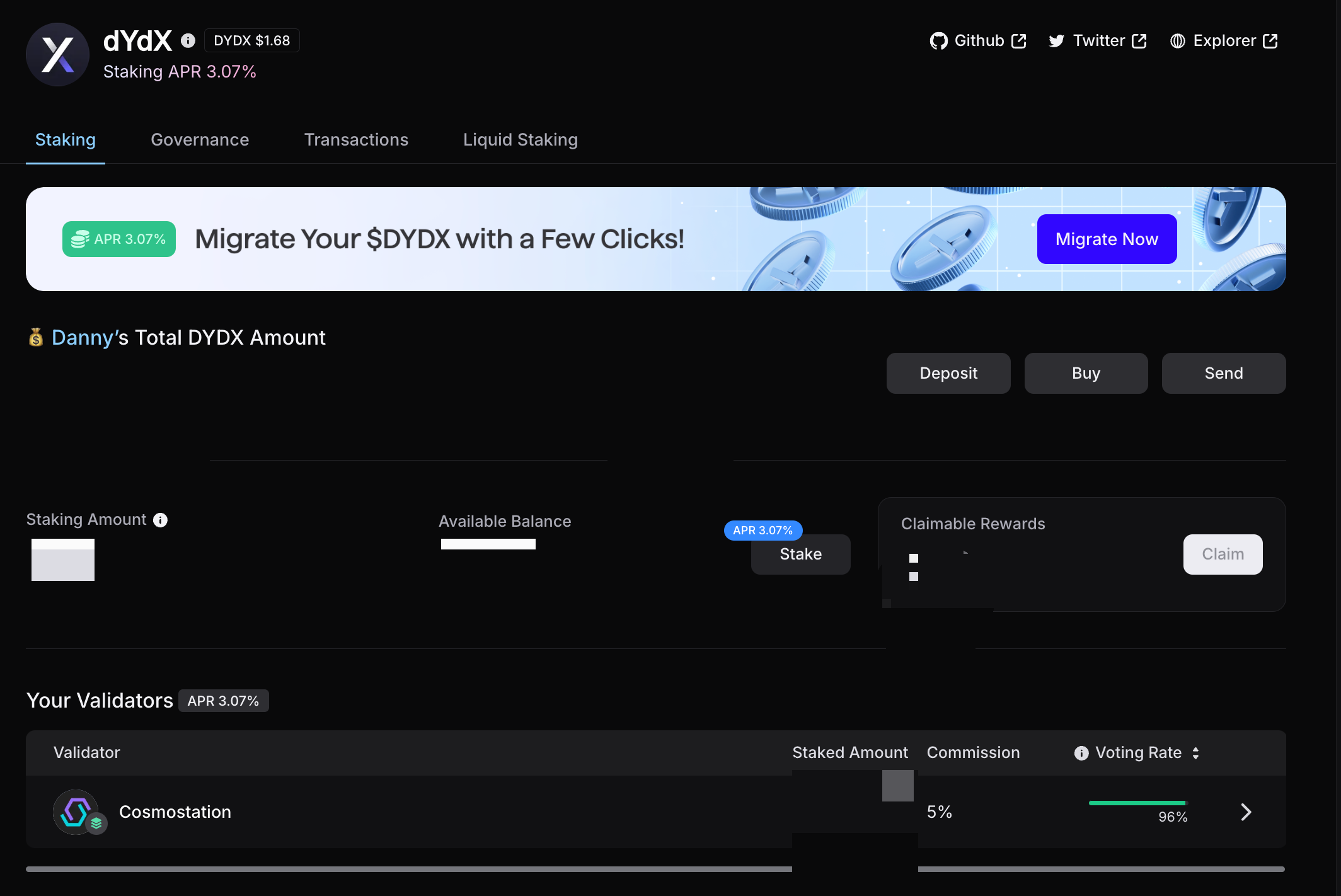- 케플러 지갑에서 DashBoard 연결 후 dydx를 검증인 선택후 스테이킹 하면 됨.