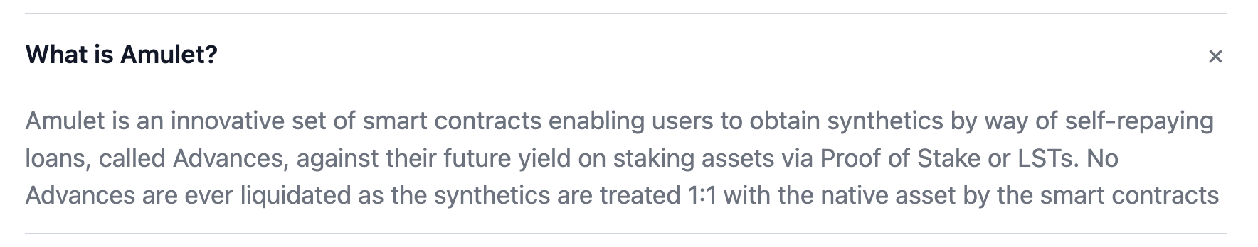 Amulet은 사용자가 지분 증명 또는 LST를 통해 스테이킹 자산에 대한 미래 수익에 대해 Advances라고 하는 자체 상환 대출을 통해 합성 자산을 얻을 수 있도록 하는 혁신적인 스마트 계약 세트입니다. 합성 자산은 스마트 계약에 의해 기본 자산과 1:1로 처리되므로 Advances는 결코 청산되지 않습니다.