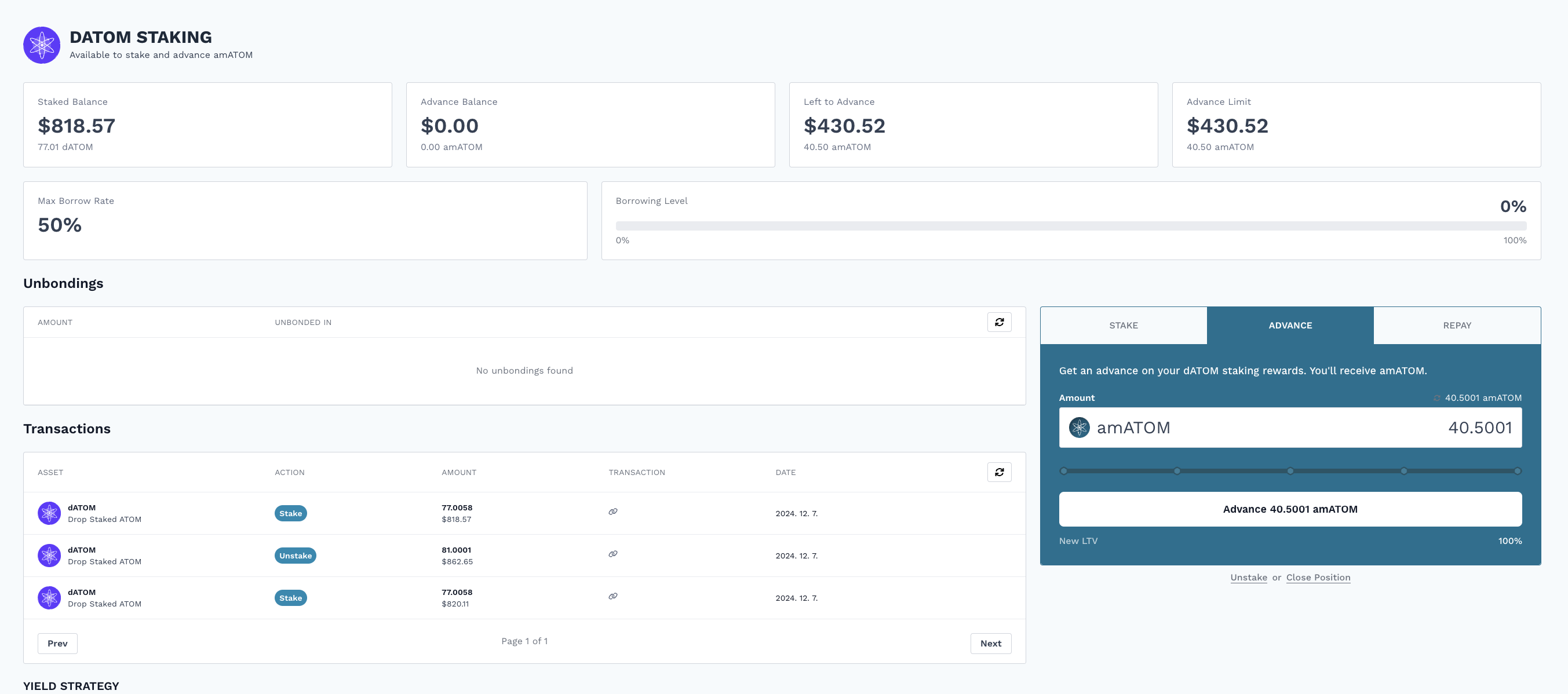 - 스테이킹된 자산(언제든 바로 언스테이킹 가능-잠금제한 없음) 기준으로 50%를 amATOM 변환 가능.