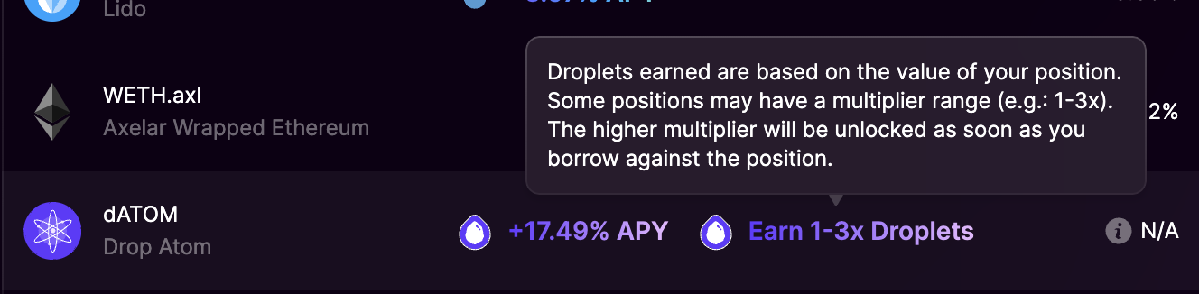 * 1-3배수의 포인트가 주어지는데, 예치된 datom 기준 다른 자산을 일부 대출해야 포인트가 더 올라가는 구조 같습니다.