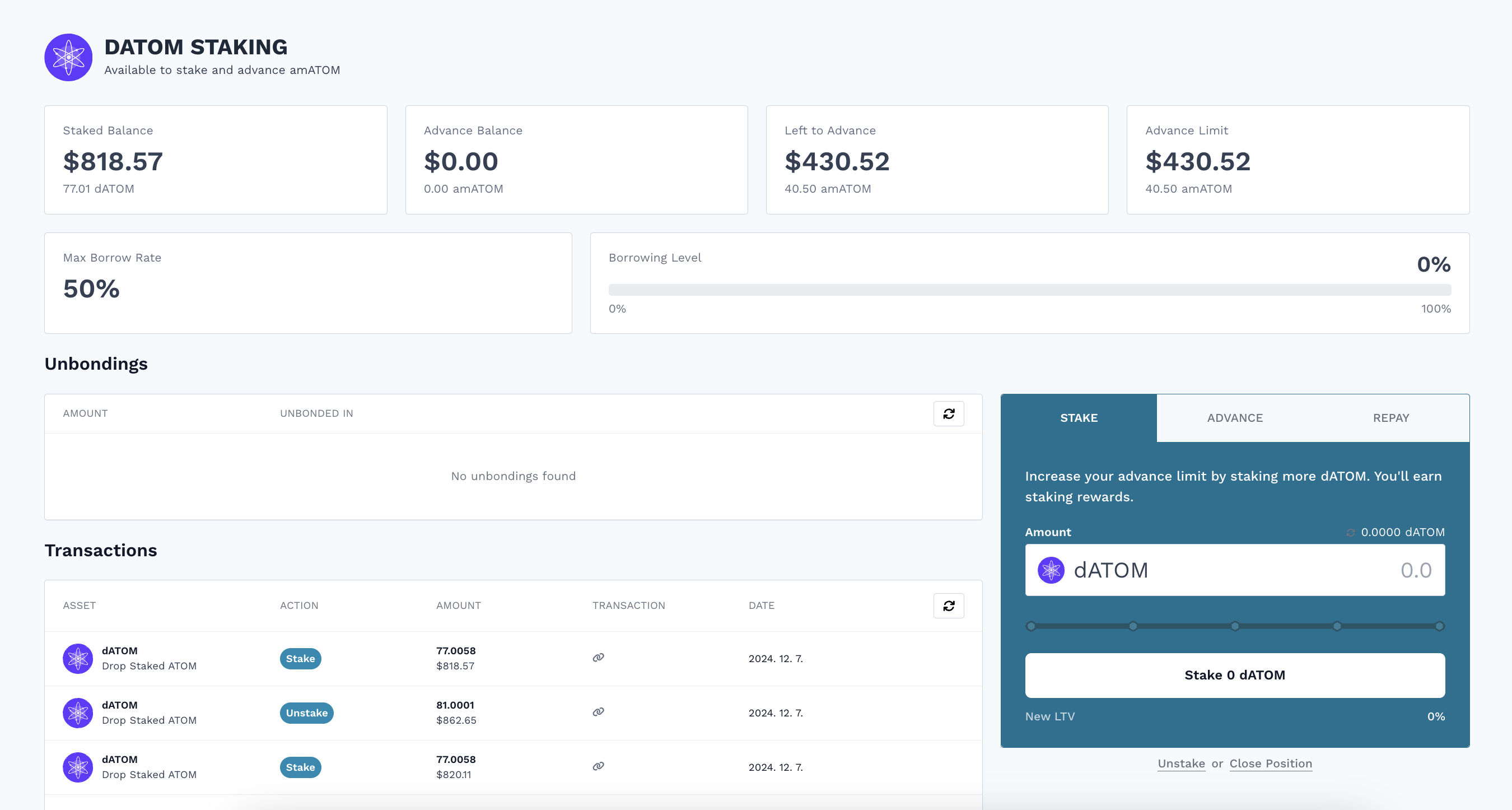스테이킹 된 ATOM을 dATOm으로 변환 가능합니다.