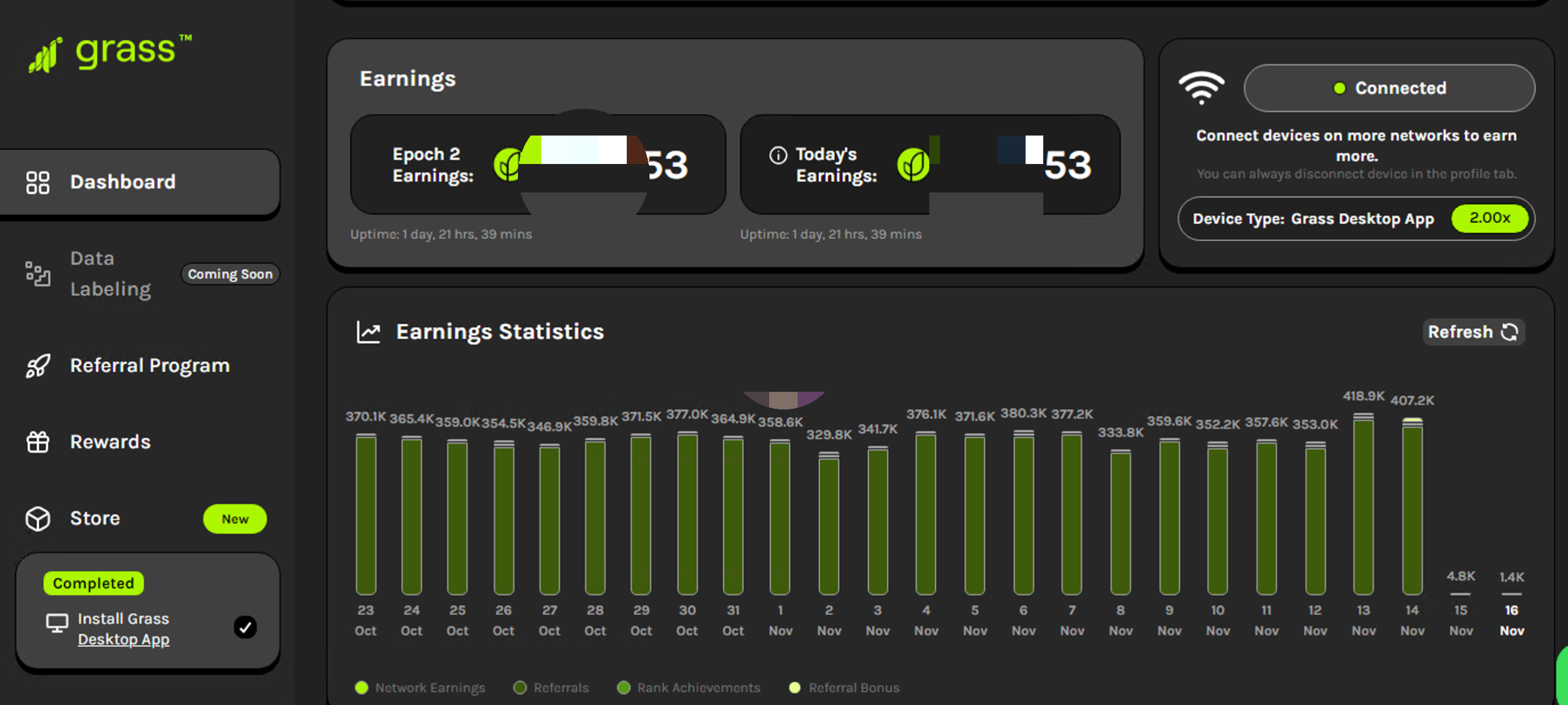 - 방법 : PC에 크롬 확장 브라우저에 Grass 한번 설치 후 가만히 두면 됨.(노력 대비 효과 좋음)
