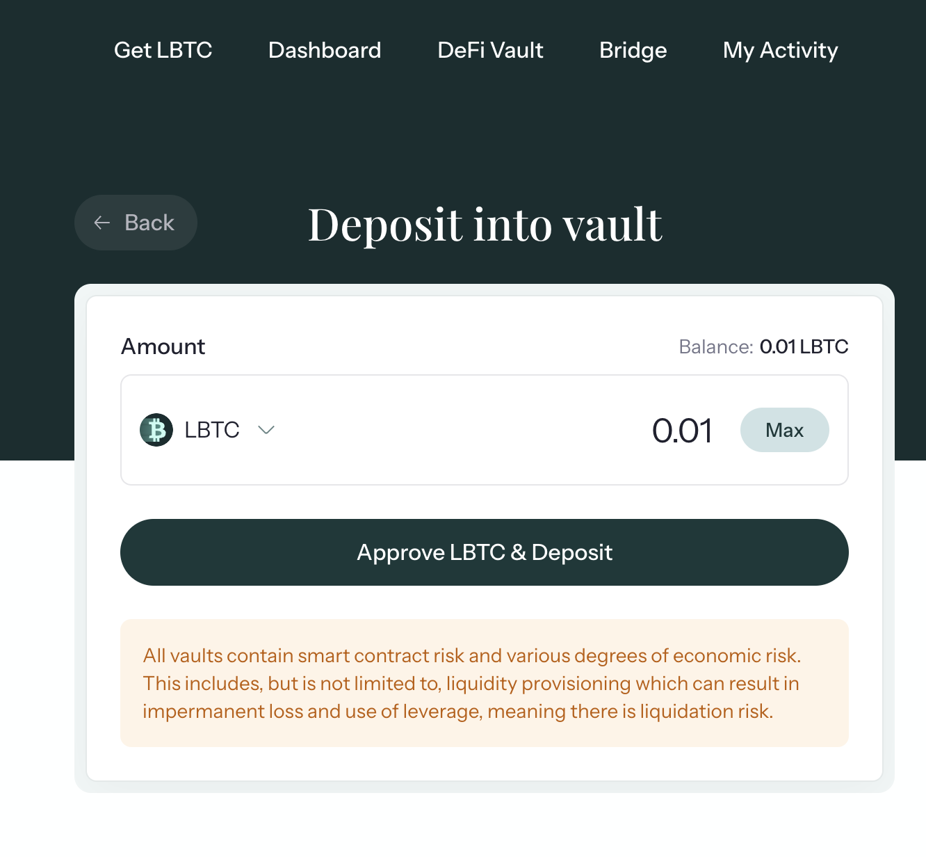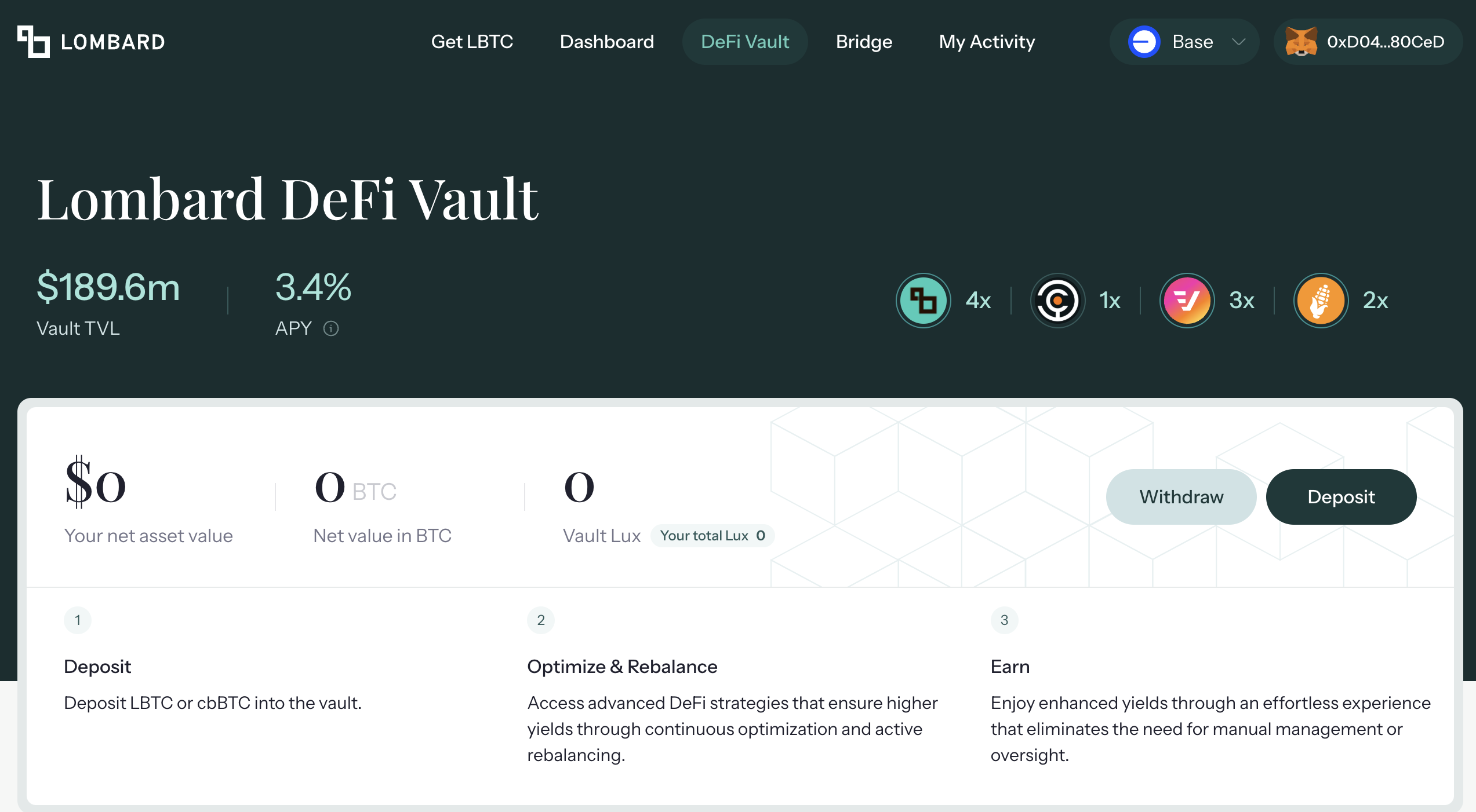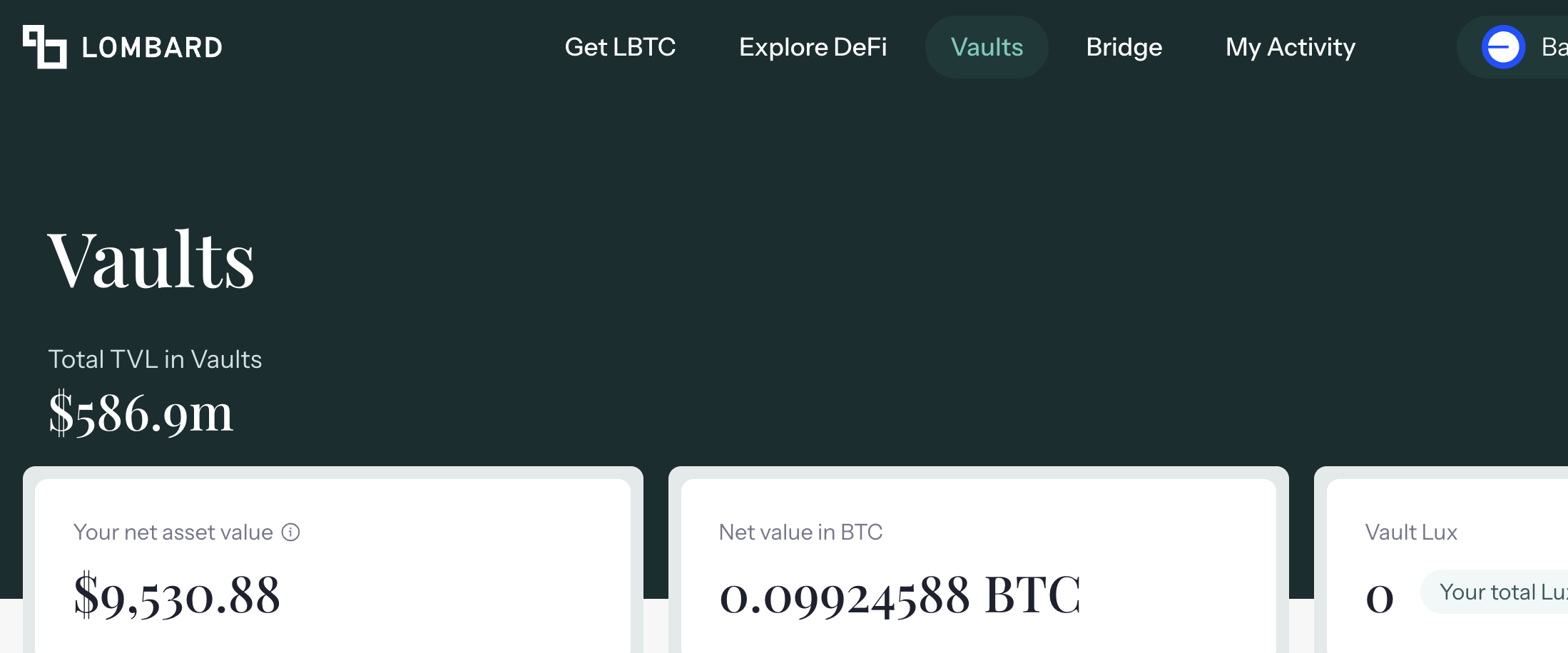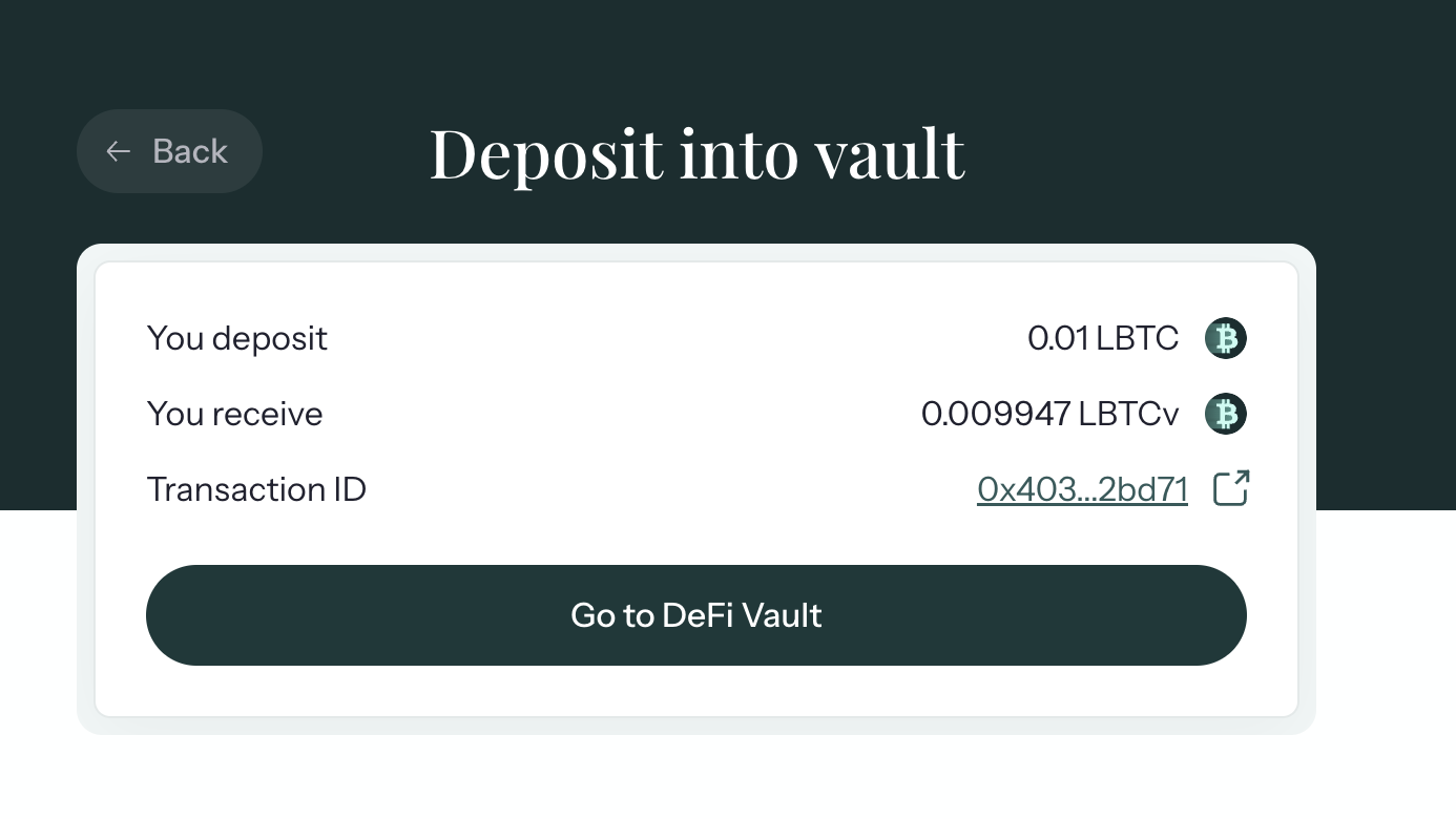 - LBTC는 스테이킹 된 BTC이며, 이를 vault에 예치하면 추가 보상과 포인트를 받습니다.