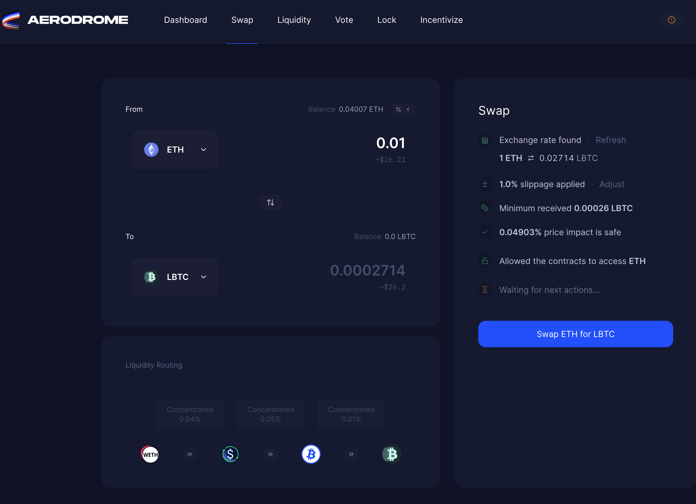 - ETH를 LBTC로 Swap합니다.
