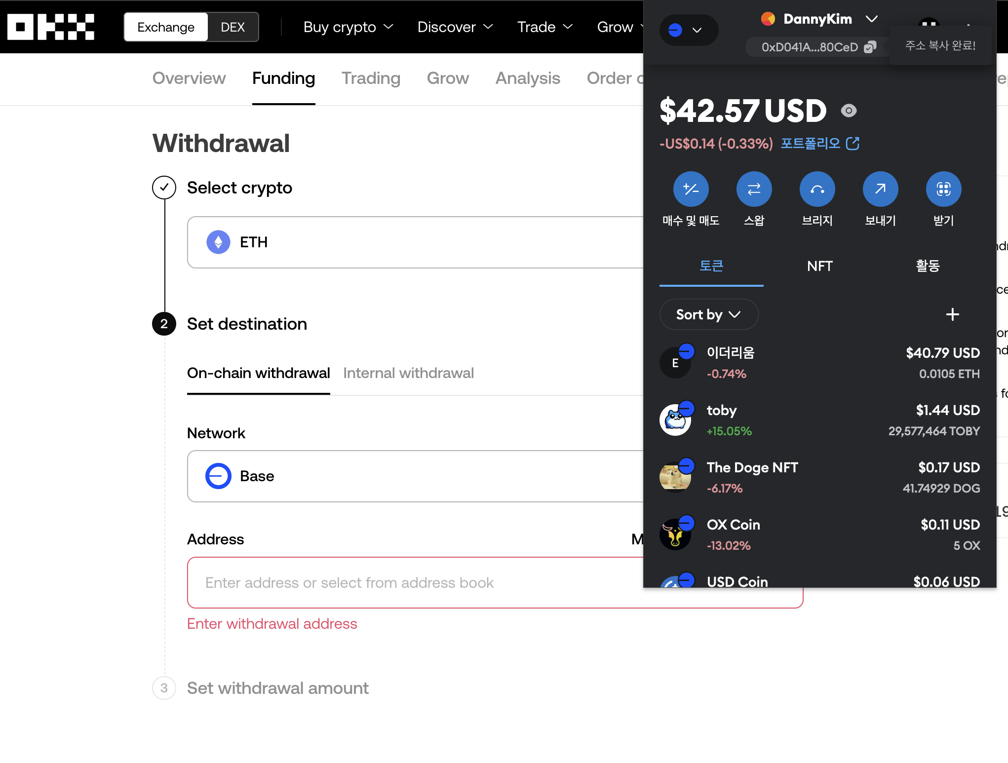- OKX에서 ETH를 Base로 보내기