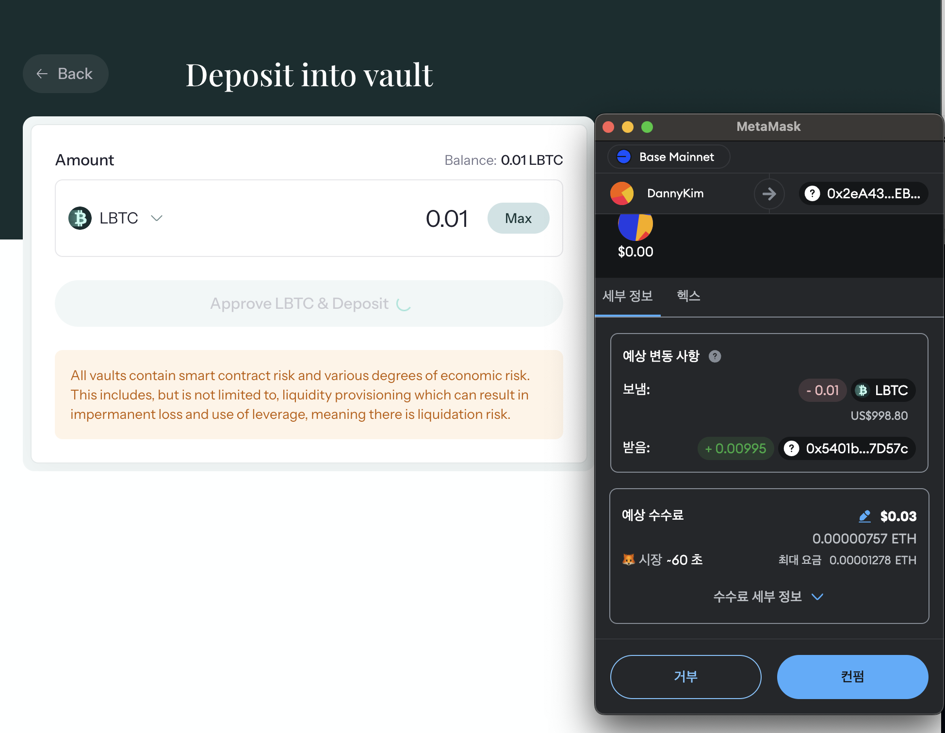 2. LBTC를 Vault에 에치하면
