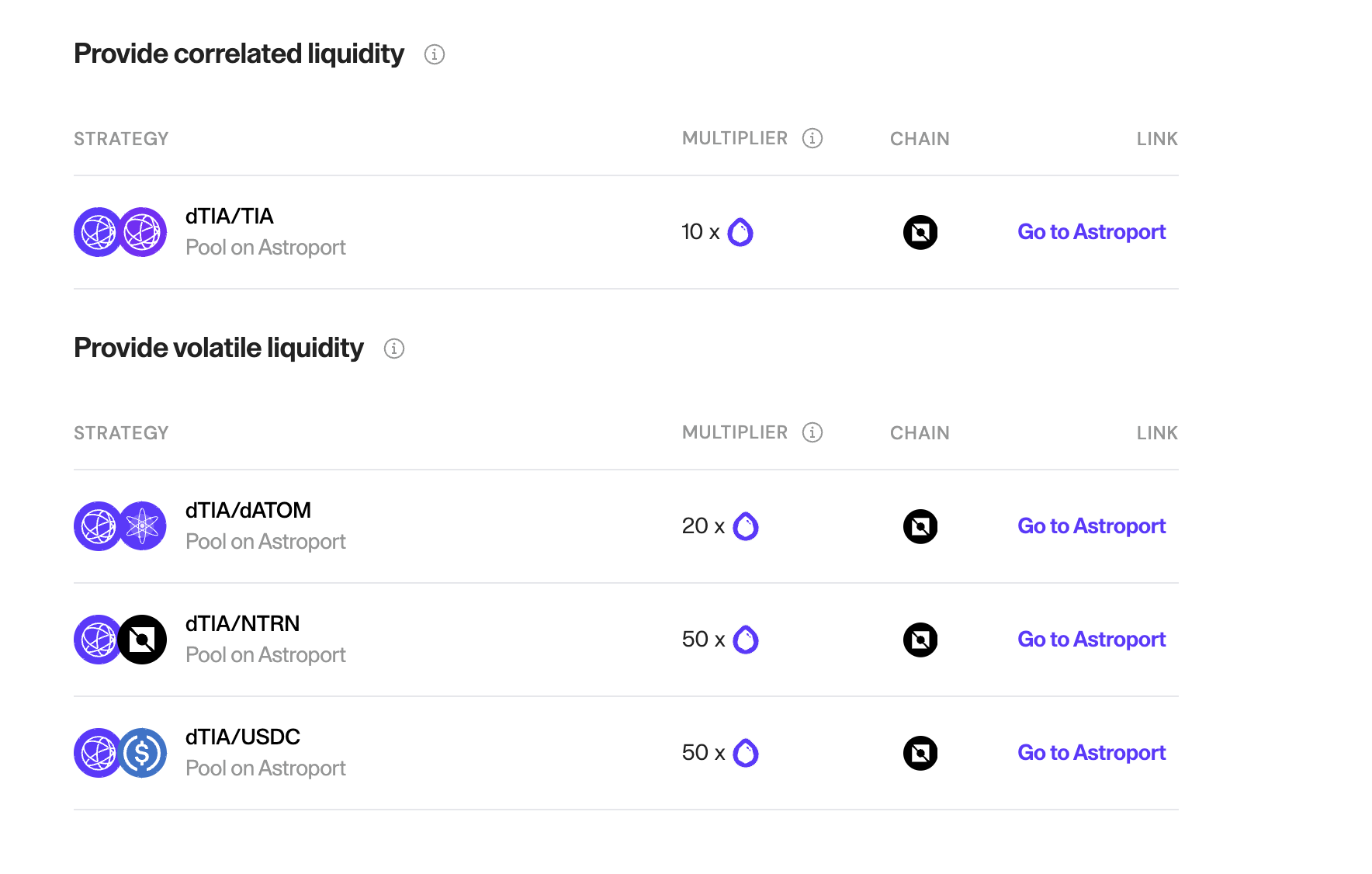 - 현재 TIA drop 포인트는 아래와 같습니다. dTIA를 그냥 홀딩하면 1배수 포인트이고 최소 astroport에 넣으면 10배수이면서 같은 코인계열이므로 비영구손실이 거의 없습니다. 아래 가이드는 dTIA/TIA 풀 기준으로 설명합니다. 풀 선택은 본인의 상황에 맞게 선택하시면 됩니다.