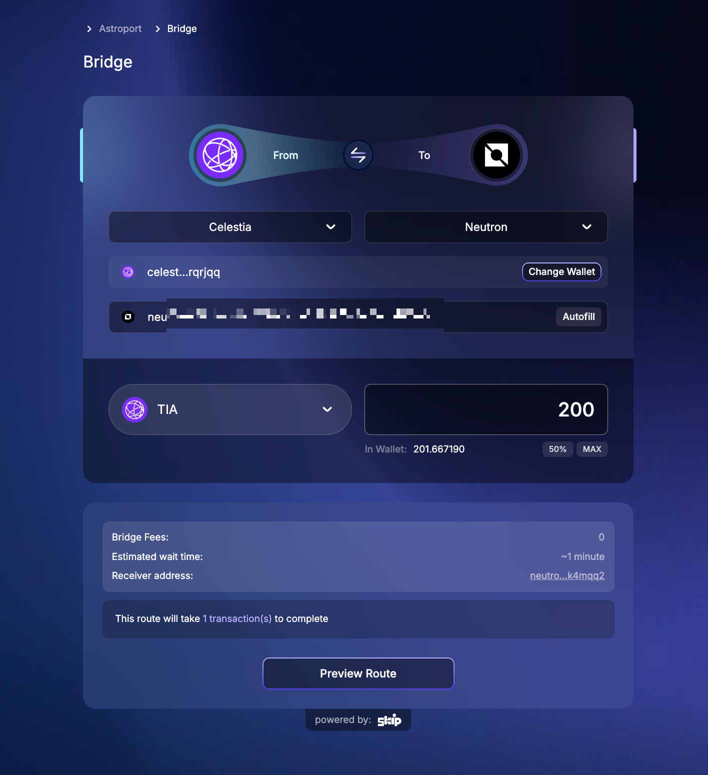 - Astorpt Bridge 메뉴 : https://app.astroport.fi/bridge?source=celestia