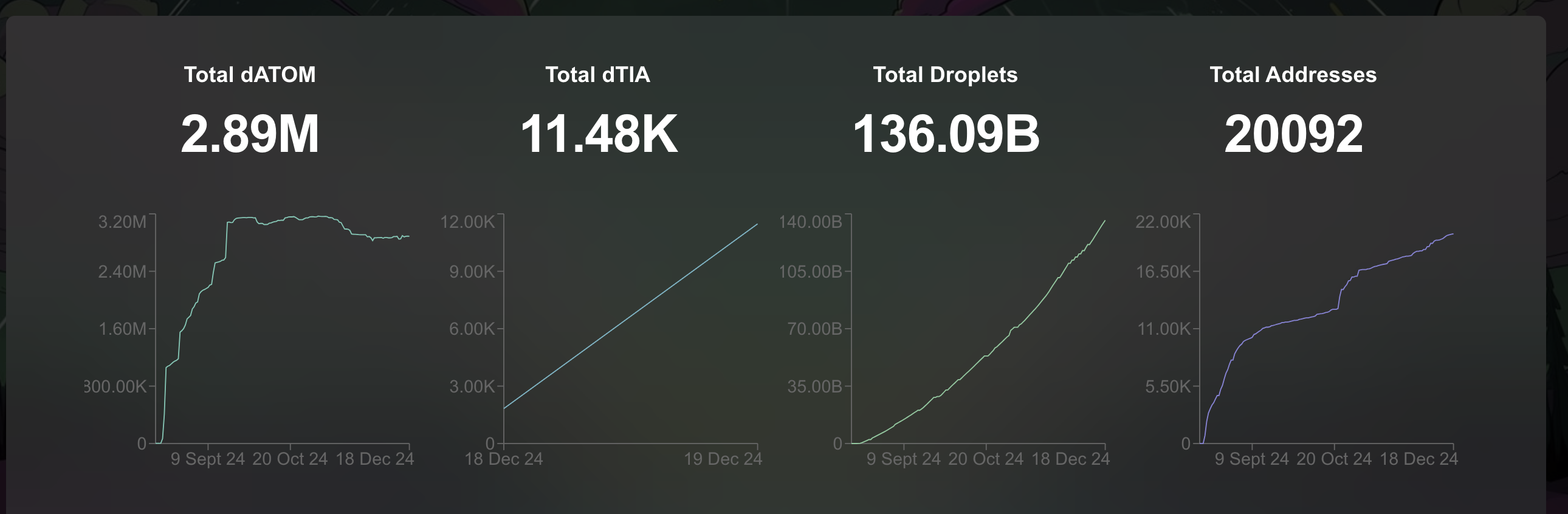 - 2024.12.22일 기준 datom은 2.89M, dTIA는 11k(최근에 런칭). 전체 포인트는 136B drop 포인트, 참가주소는 20092개입니다.