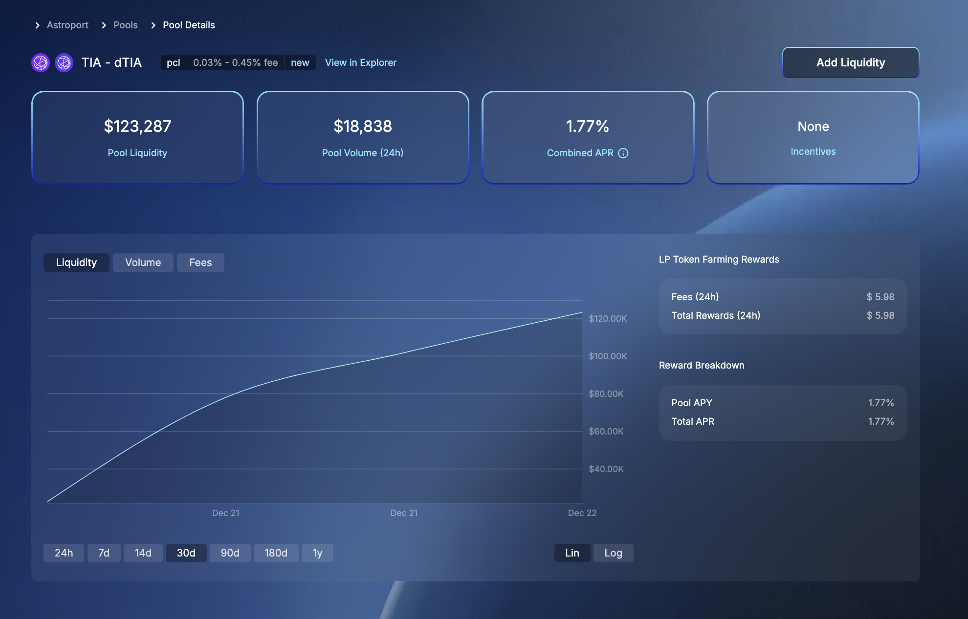 - 현재 TIA drop 포인트는 아래와 같습니다. dTIA를 그냥 홀딩하면 1배수 포인트이고 최소 astroport에 넣으면 10배수이면서 같은 코인계열이므로 비영구손실이 거의 없습니다. 아래 가이드는 dTIA/TIA 풀 기준으로 설명합니다. 풀 선택은 본인의 상황에 맞게 선택하시면 됩니다.