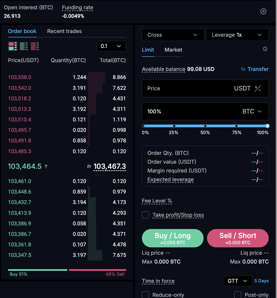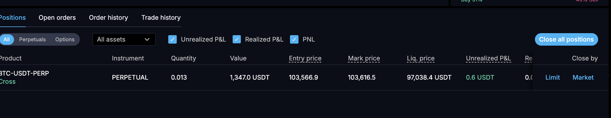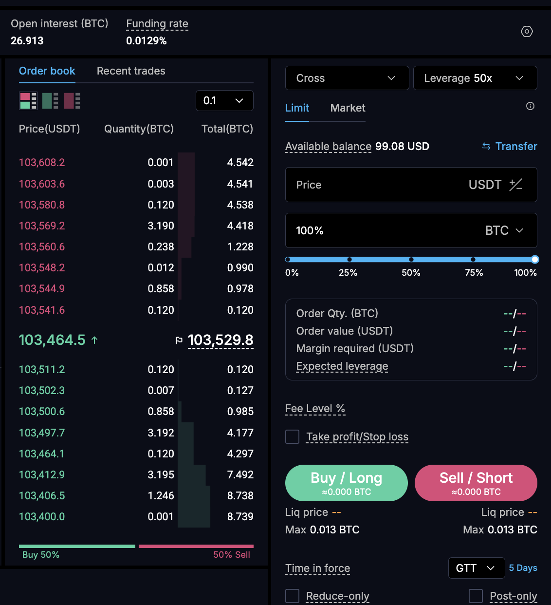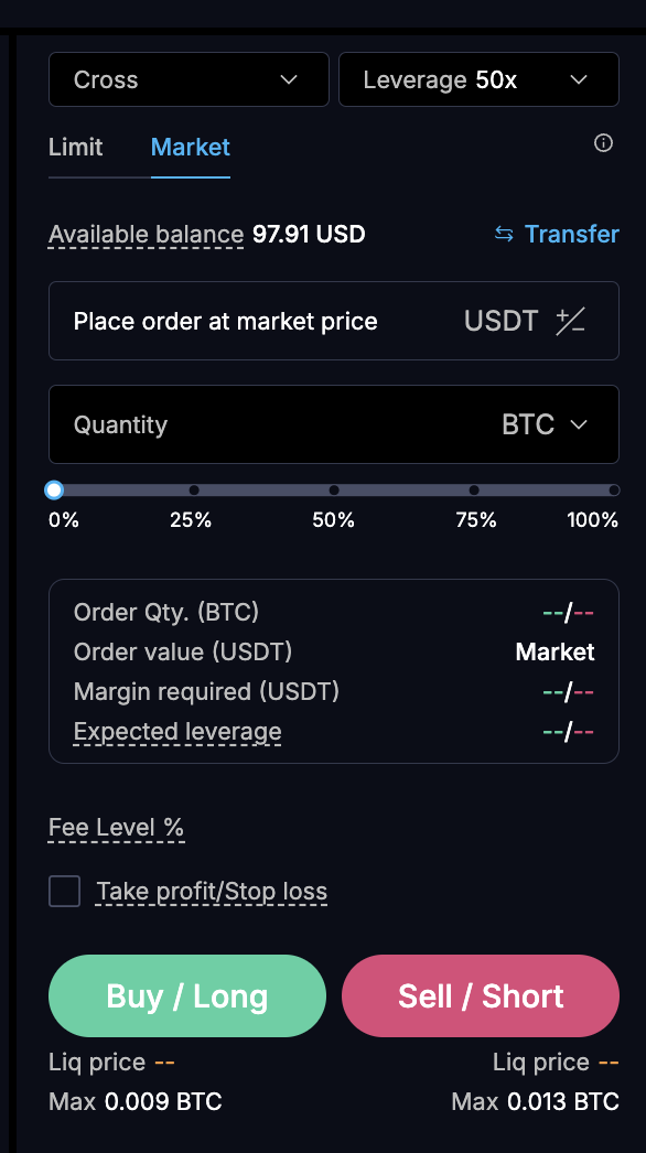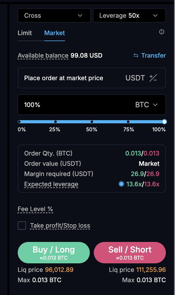- 100으로 50배 레버리지로 바로 Long 이후 포지션을 닫습니다.