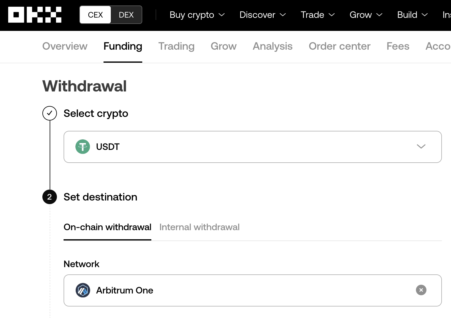 - 입금은 아비트럼으로 USDT를 보낼수 있습니다. OKX, 바이낸스에서 보내거나 지갑으로 보내도 됩니다.(OKX 아래 그림 참고)