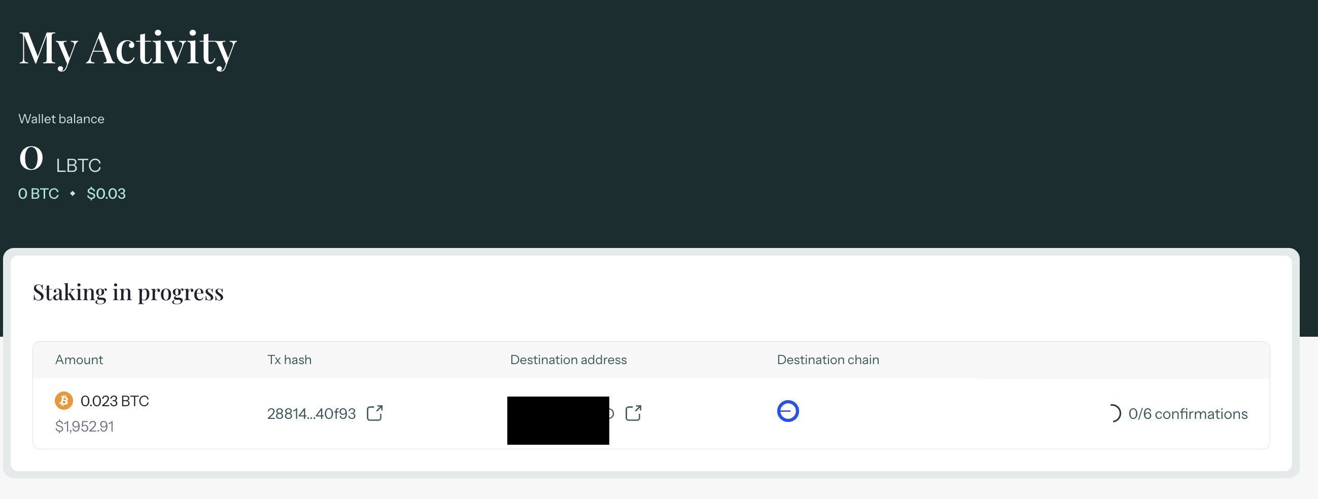 - View staking activity를 클릭하면 MyActivity로 연결되면서 최종 컨펌까지 확인 할 수 있습니다.