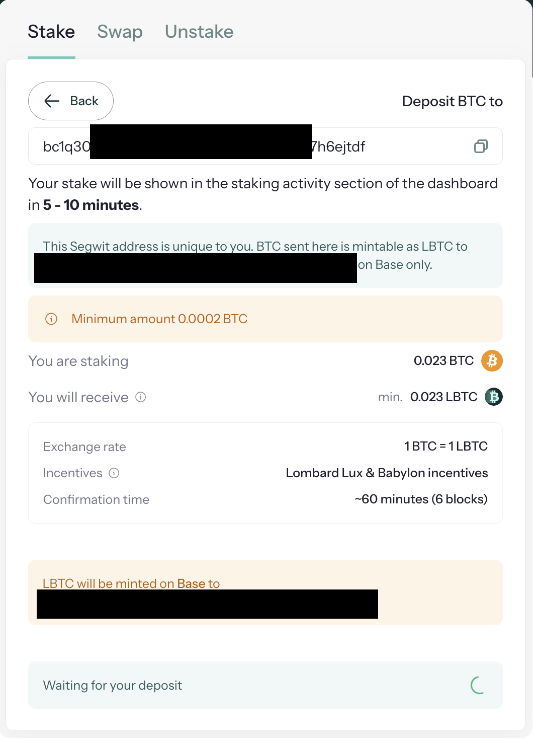 - 롬바드에서 Stake에 BTC 수량 입력.
