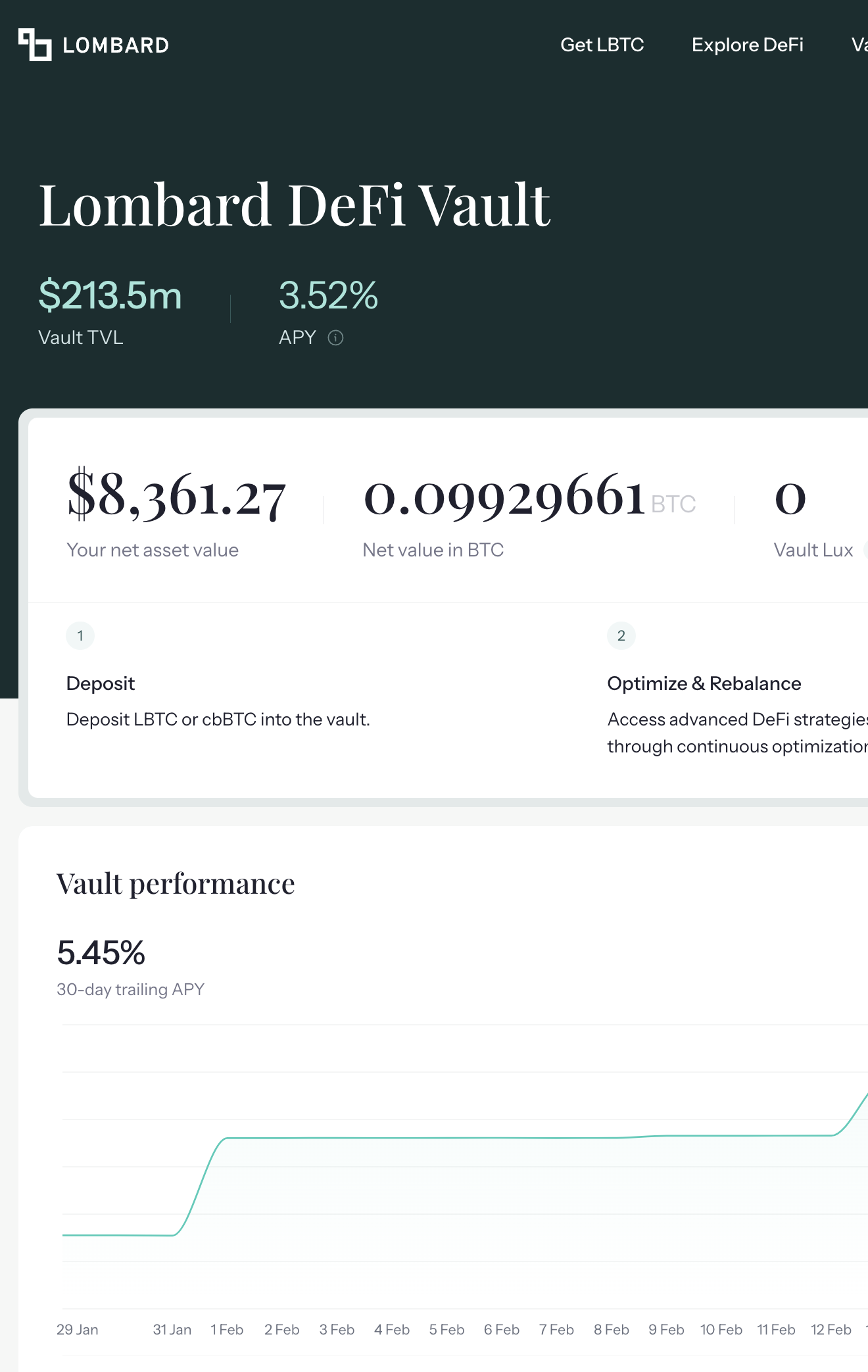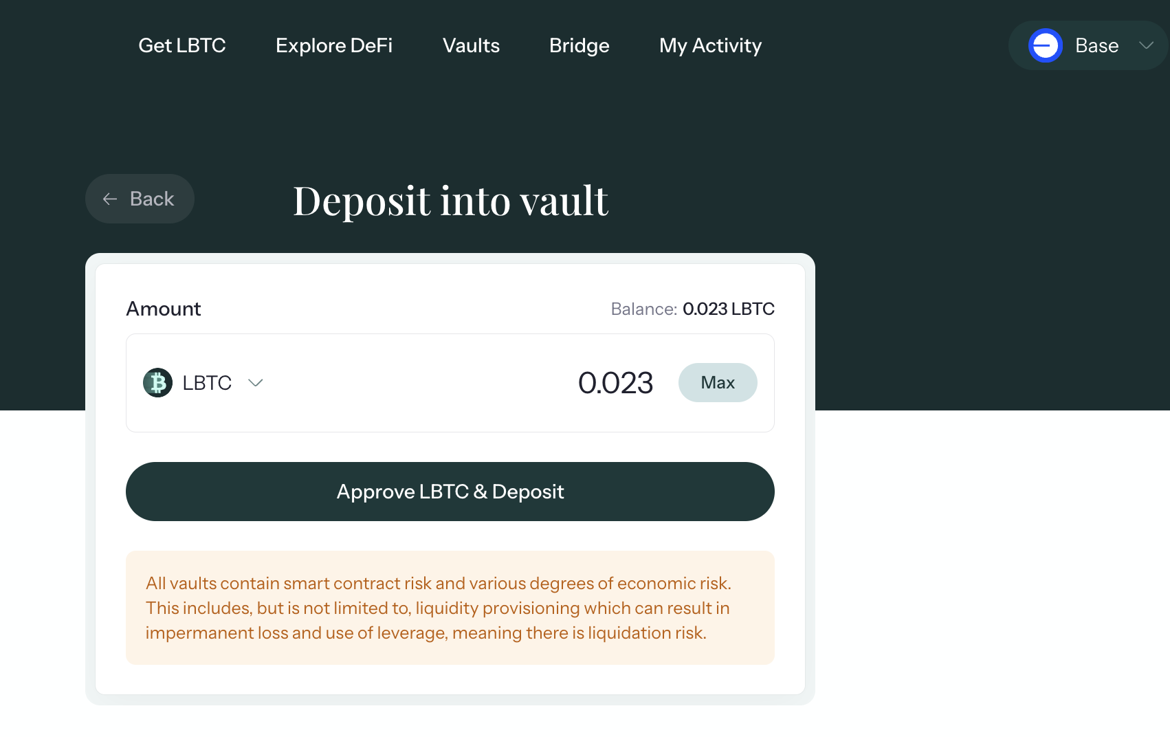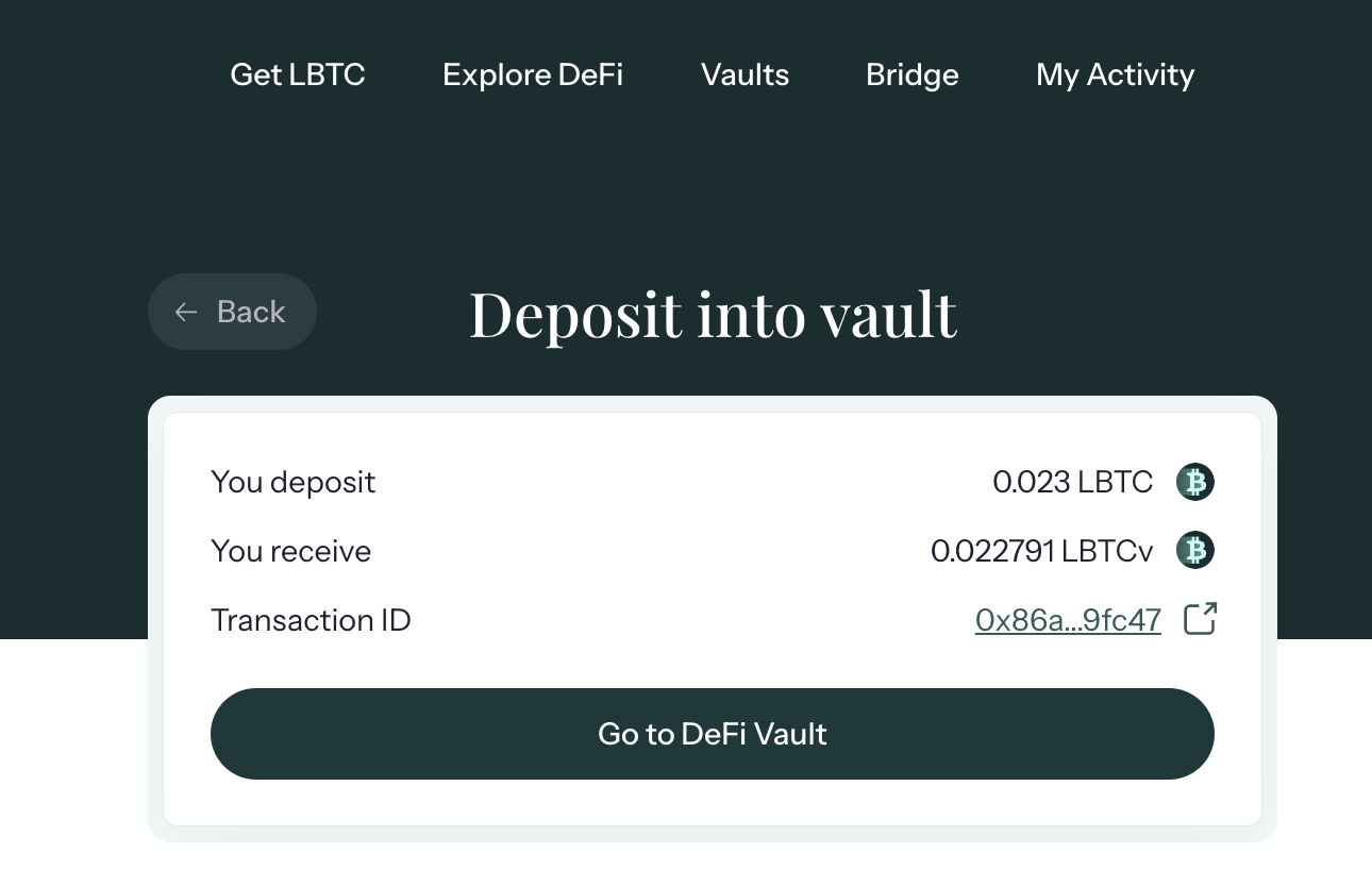- 이 LBTC를 Vault에 입금하면 됩니다. Vault 메뉴에 첫번째 DeFi Vault에 입금. (다른 풀에 넣을수도 있음)