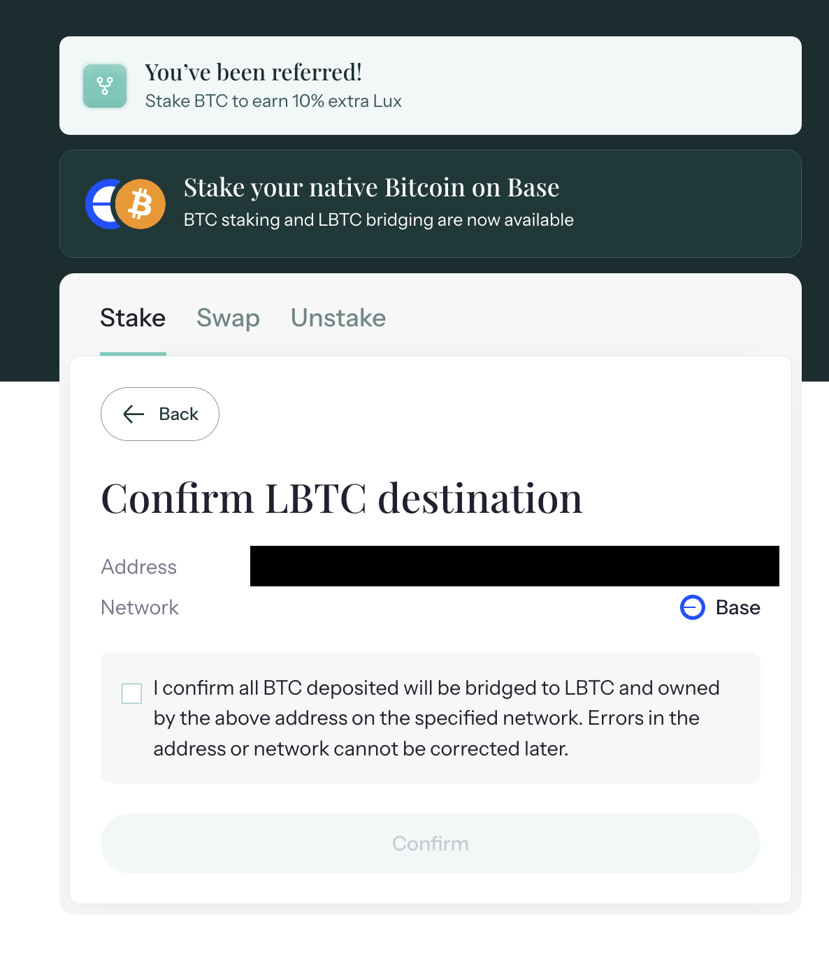 - 수량 입력후 Get Lbtc on Base를 누르면 컨펌 메뉴가 나옵니다.(이더 메타마스크 지갑에서 승인합니다.)