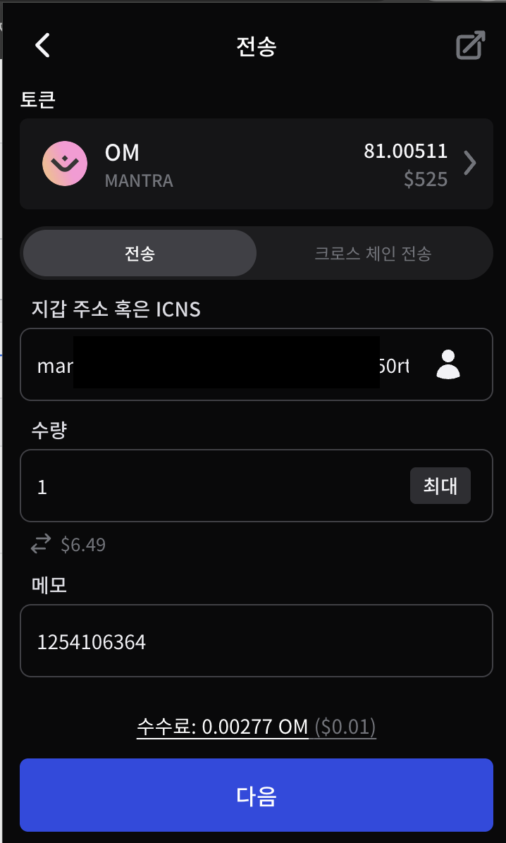 - 코인원에서 OM 검색후 입금주소 및 메모 생성