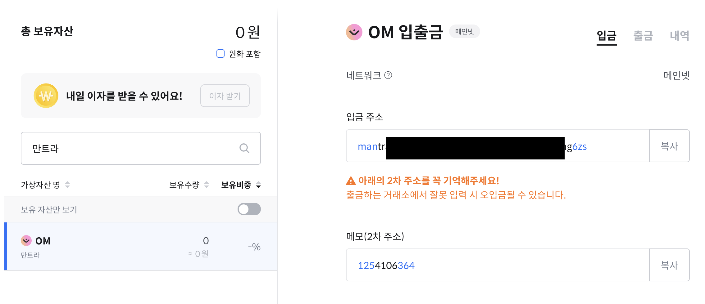 - 코인원에서 OM 검색후 입금주소 및 메모 생성