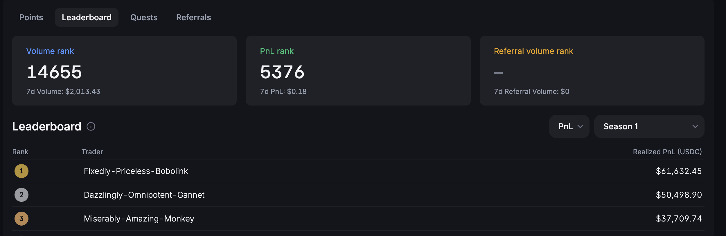 (포인트는 볼륨 작, PnL , 레퍼럴 3가지 있어요)