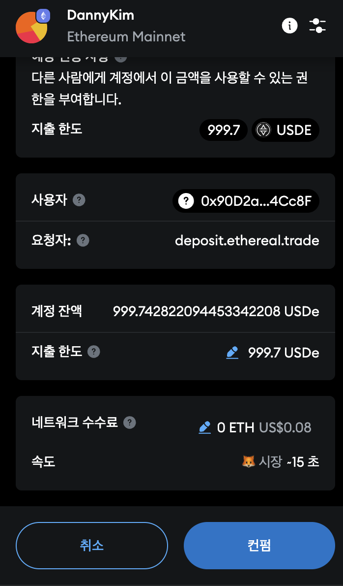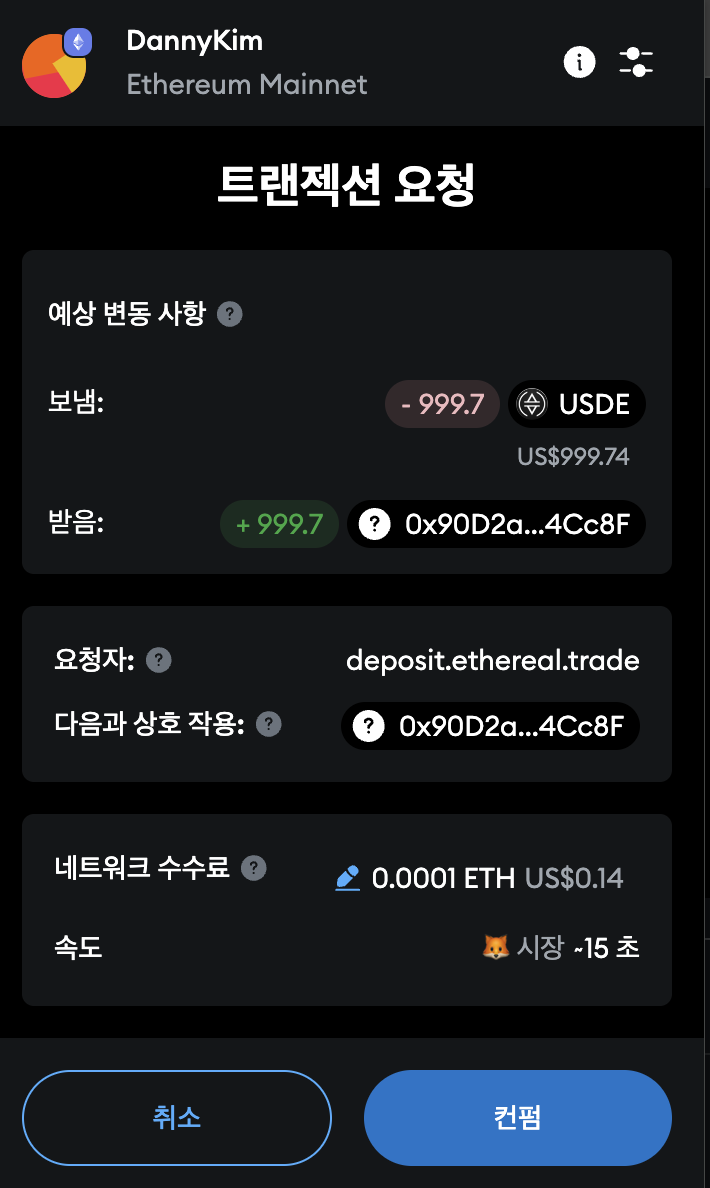 - 이더 메인넷에서 USDE를 Ethereal에 예치하면 됨.