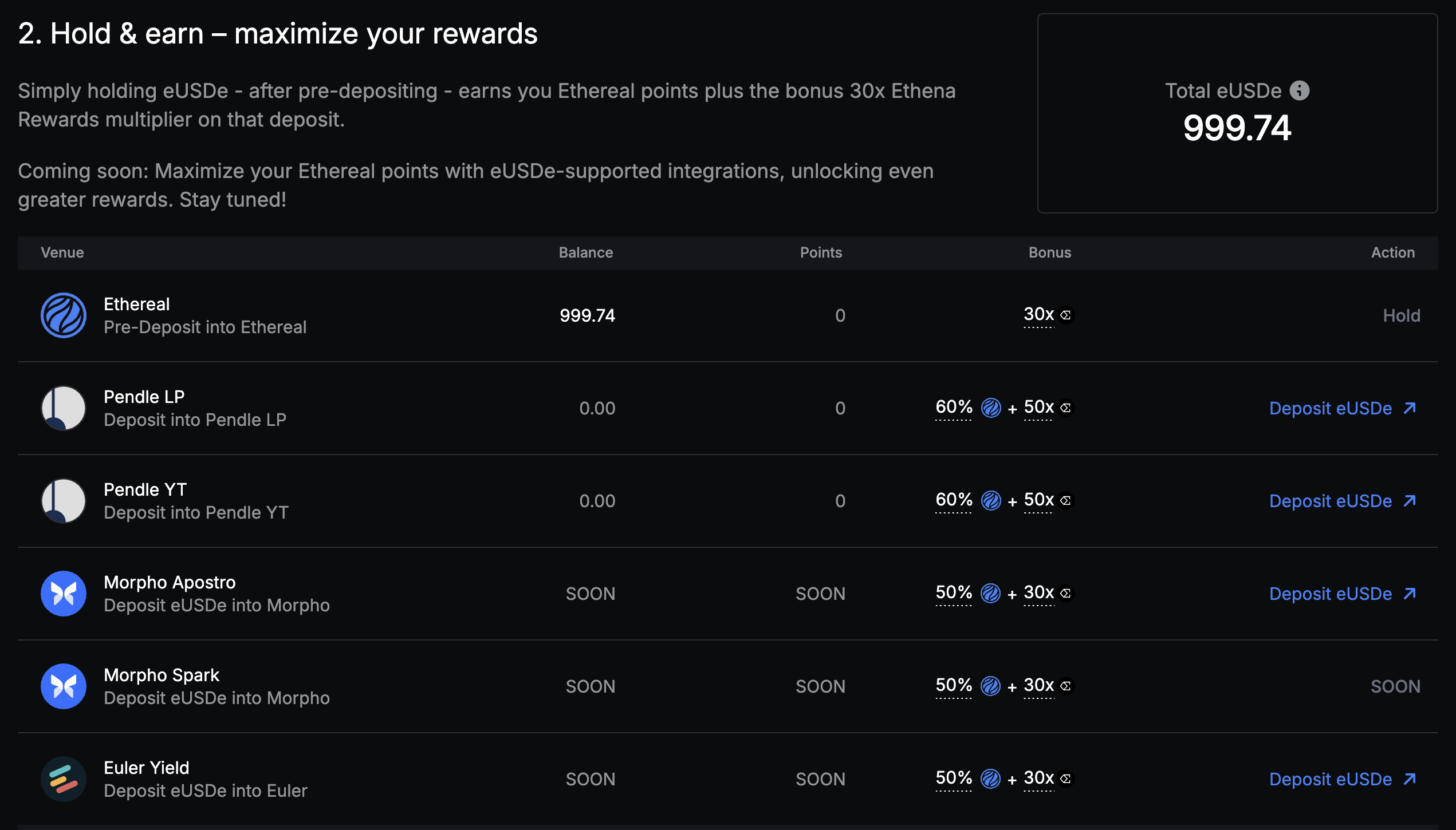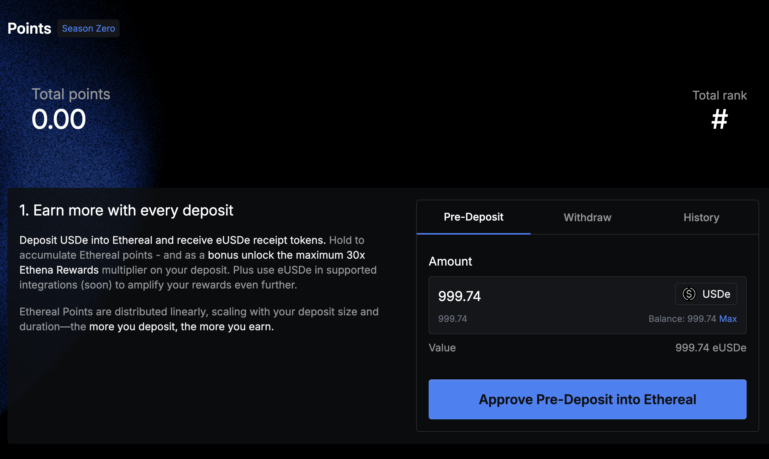 Pre-deposit now, join Season Zero, and start stacking Ethereal Points & Ethena Rewards..