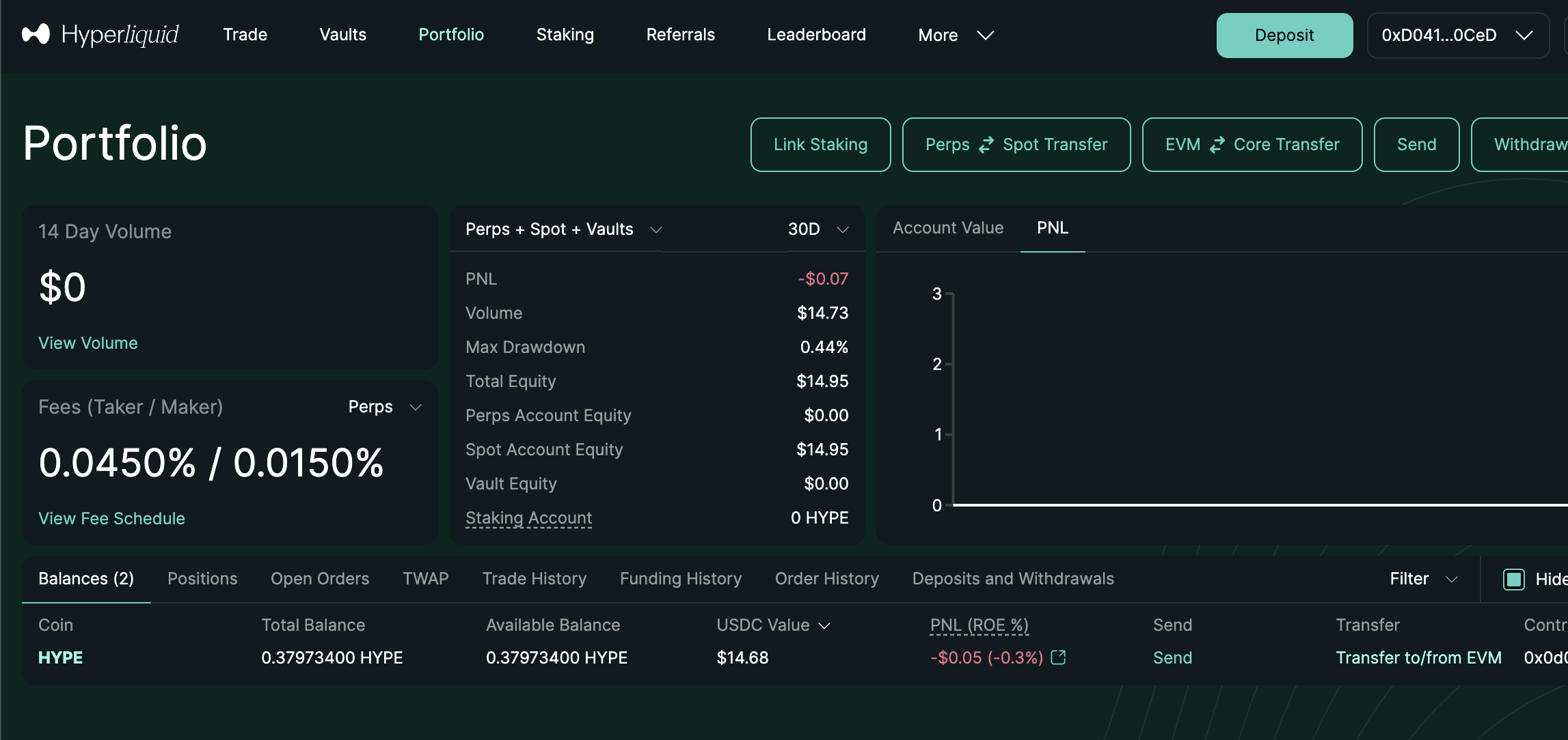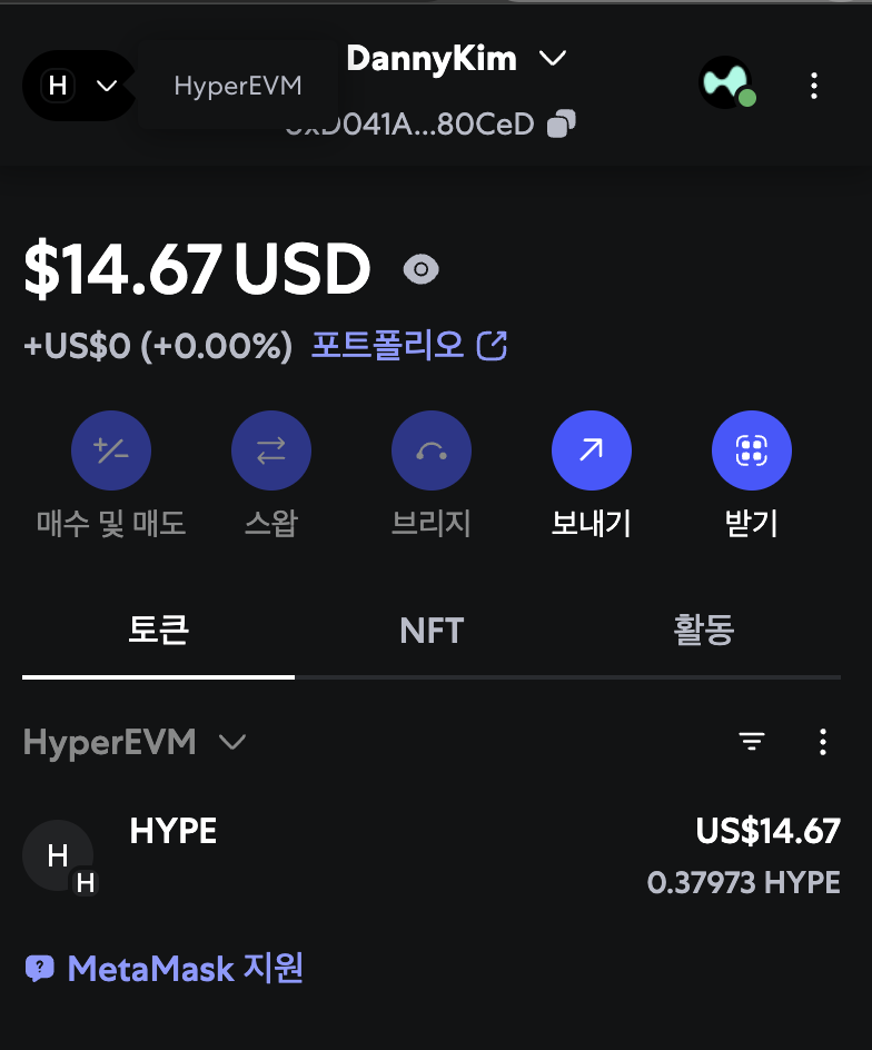 - 포트폴리오 메뉴에서 오른쪽 하단에 Transfer to EVM으로 hype 전송