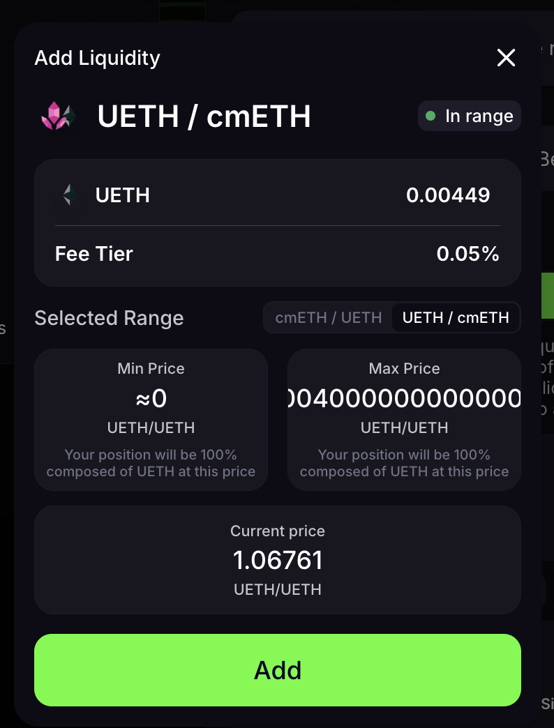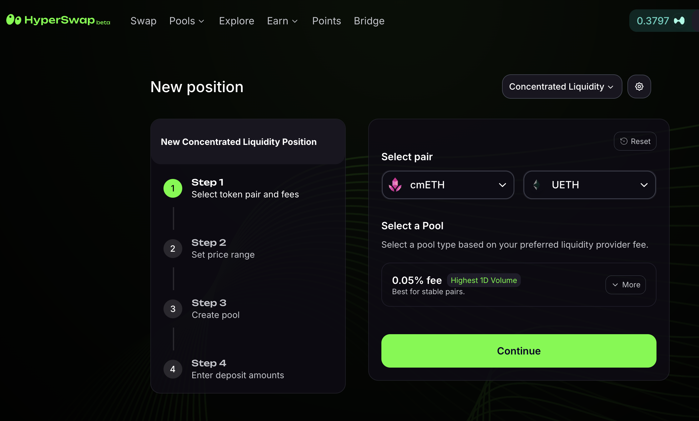 2. cmETH 구매후 하이퍼리퀴드 hyperswap에 유동성 공급