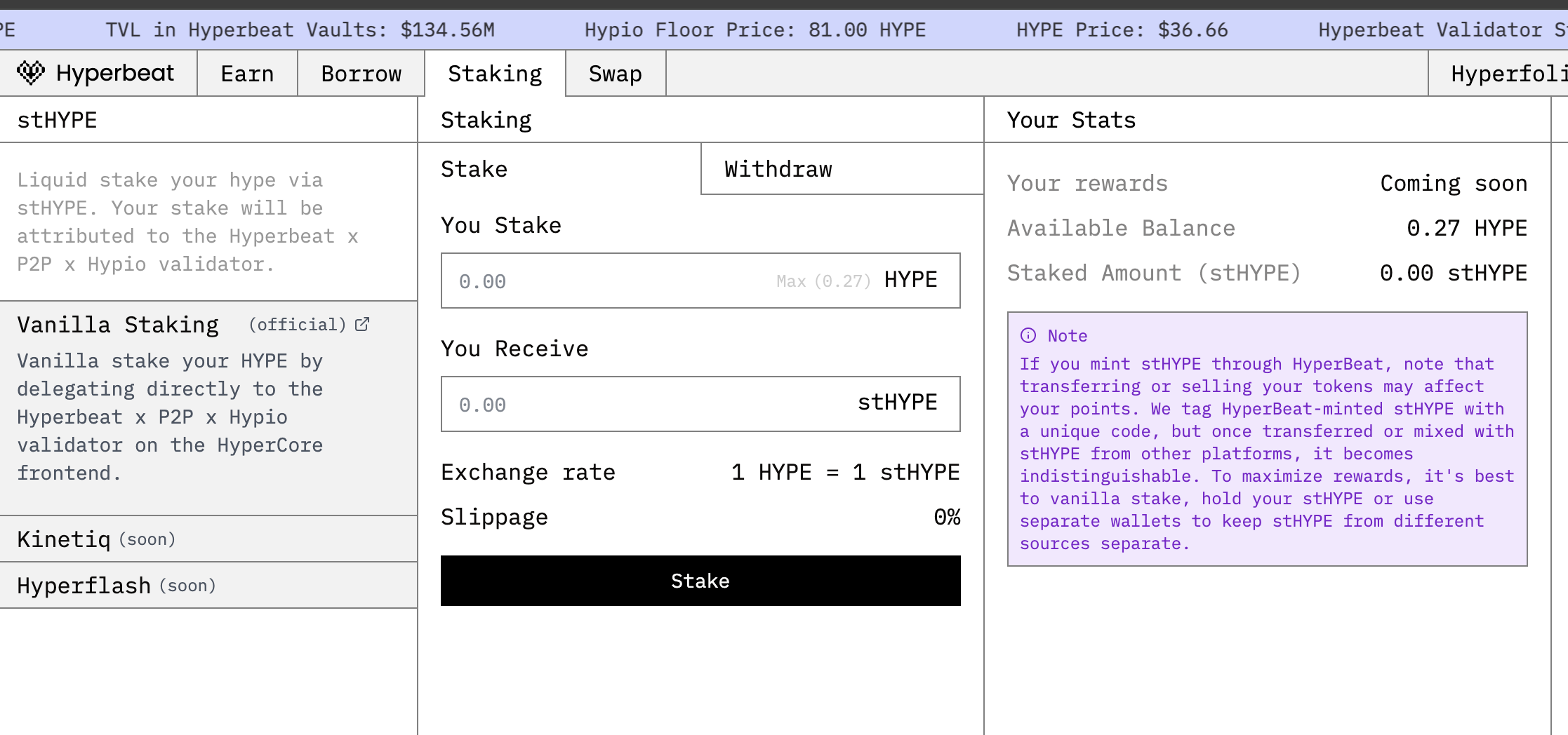 - 순서는 브릿지로 넘긴 자산을 swap하고, Hyperbeat에서 스테이킹 하고, 스테이킹 된 자산을 HypurrFinance에서 예치합니다.