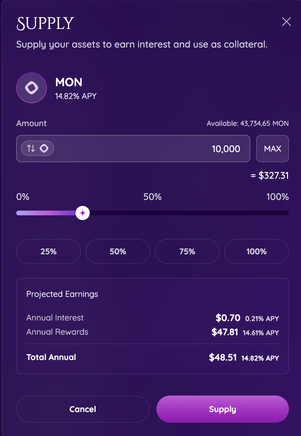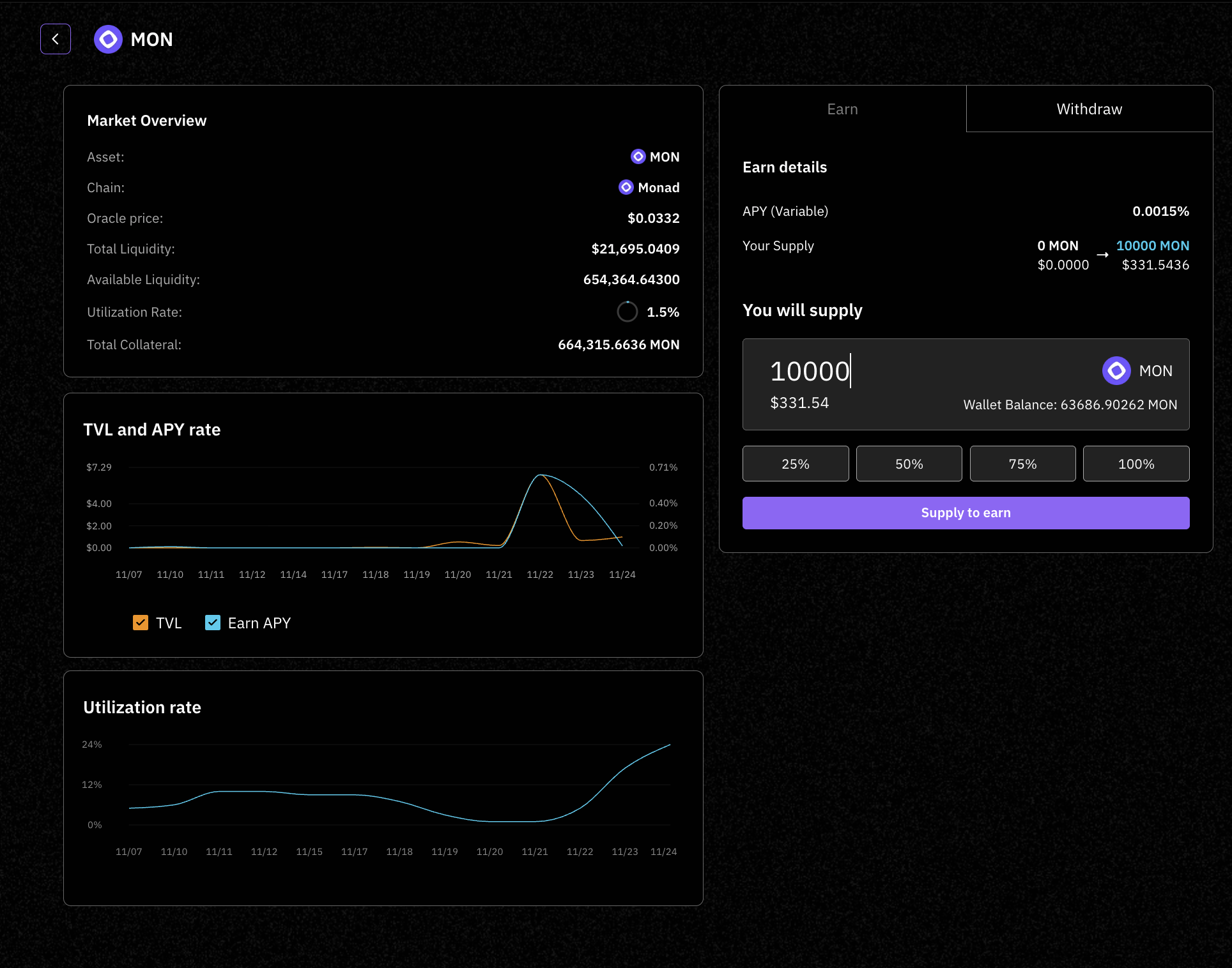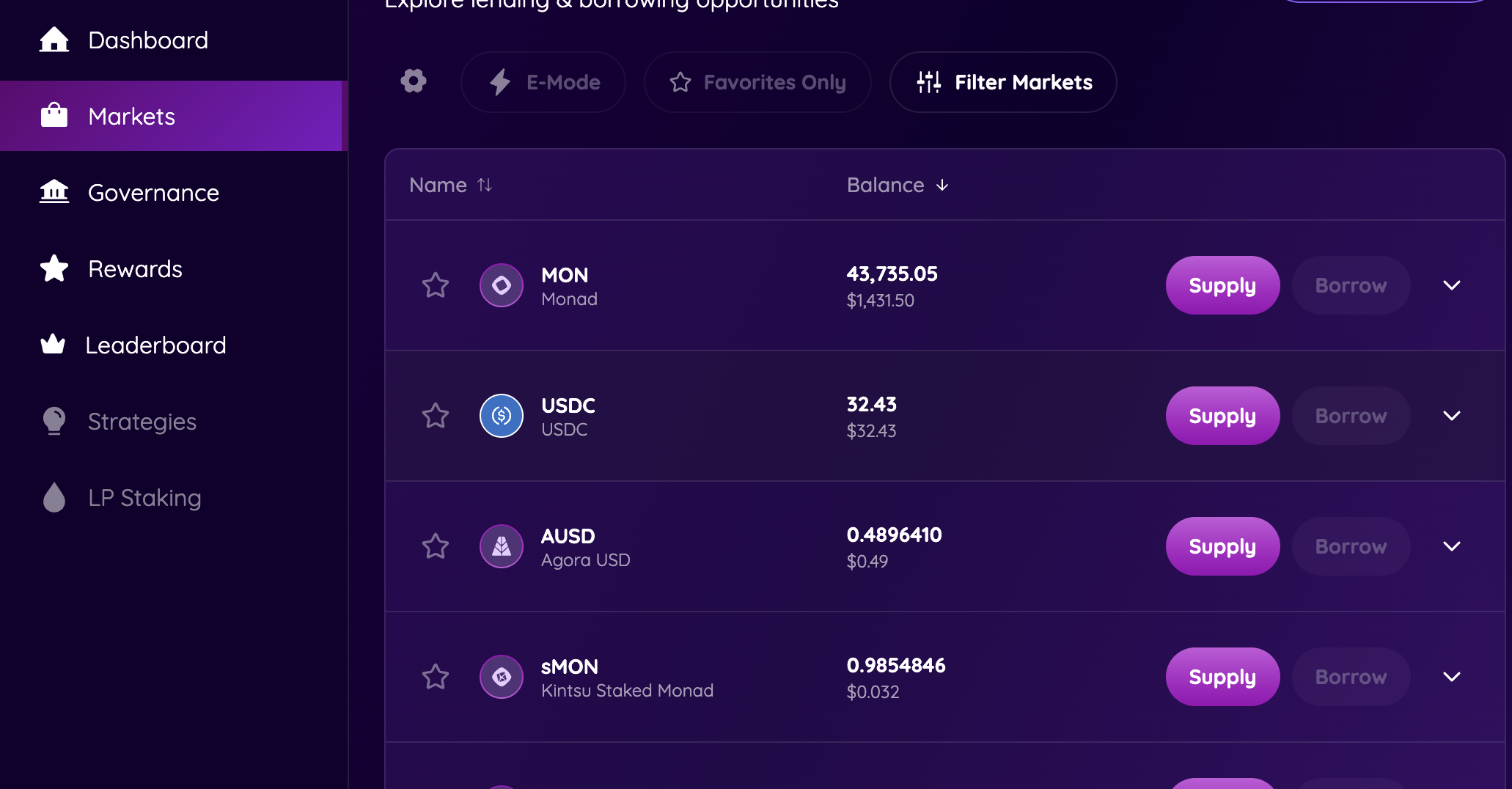 Lend, borrow & leverage assets using the most secure, efficient, interoperable lending protocol on Monad.