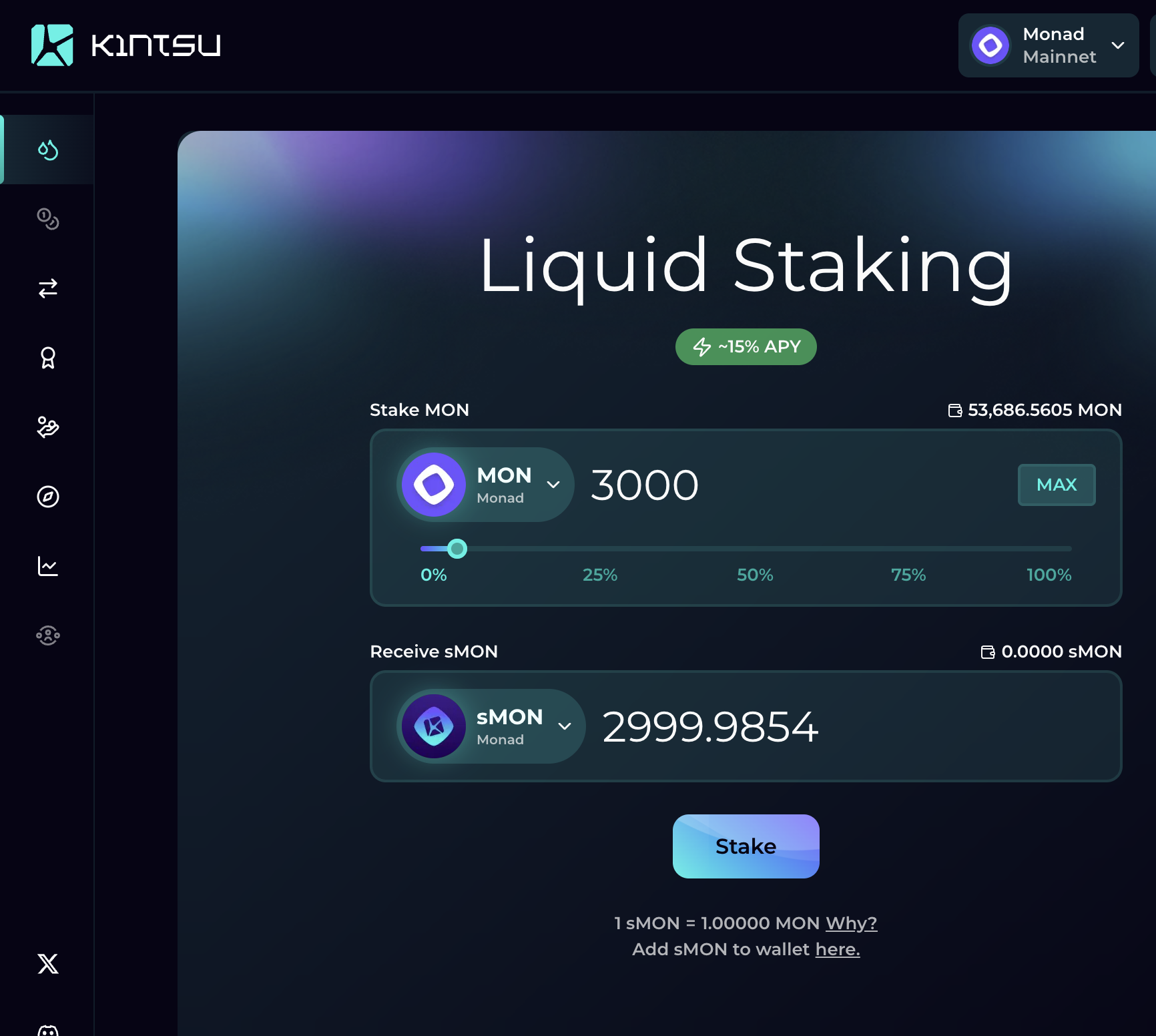 2. KINTSU - 리퀴드 스테이킹(MON을 sMON으로 리퀴드 스테이킹으로 만들어줍니다!)