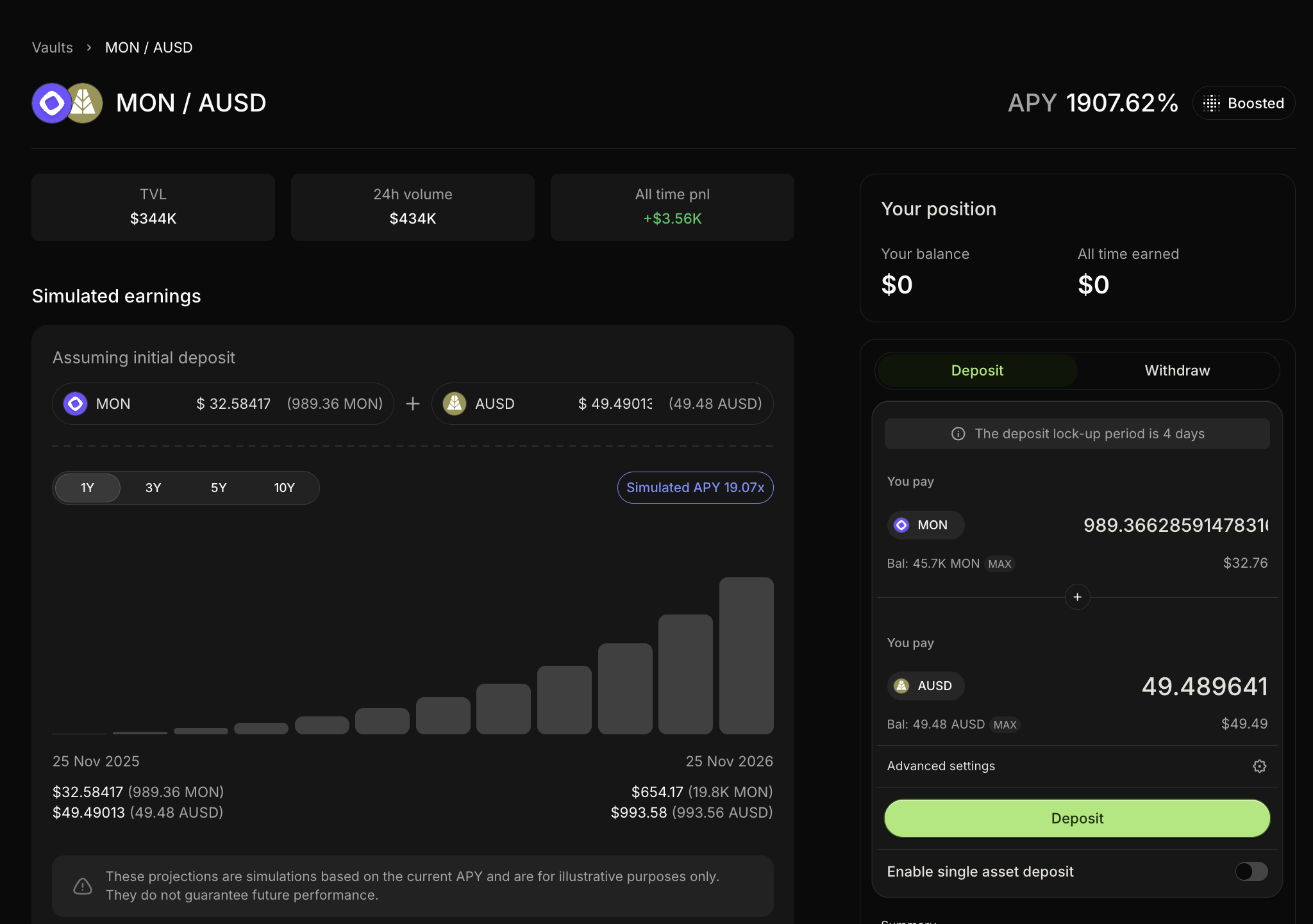 - MON으로 아래와 같이 단일 에셋으로 넣으면 자동으로 MON/AUSD로 풀 넣습니다.